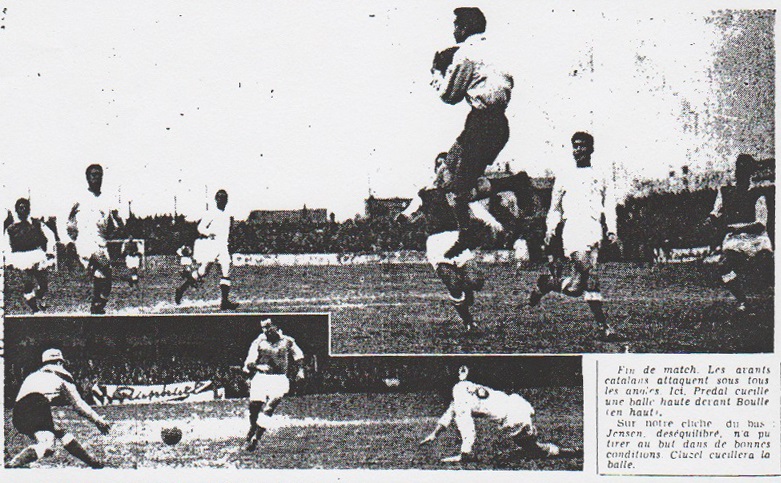 Mesas fournit une prestation honorable et dégagea plusieurs balles dangereuses. Rustichelli n'était pas en condition physique, il n'avait pas la cadence et sa production s'en ressentit largement. Andersson n'était pas remis de sa blessure et pris en charge par deux hommes, il ne mit à son actif qu'un bolide sur le montant droit (40me). Mercurio effectua un labeur obscur, zélé mais sans grand éclat. Stan Curyl fut très accrocheur au cours du premier half mais par la suite il baissa de ton. Dans l'équipe catalane Loiseau, Petitfils, Pierre Sinibaldi et César en opérait avec beaucoup de relief. Loiseau "boucla" Andersson avec autorité, le frère de l'ancien international rémois se montra infatigable, l'entraîneur-joueur fut mieux qu'un stratège, un goal-getter terriblement efficace. L'Espagnol de Barcelone, admirable technicien exécuta un magnifique tir croisé à la 55me. Ibanez accrocheur en diable bon ratisseur mérita une mention ainsi que Boulle dont la hargne causa plus d'une fois la perturbation au sein des 18 mètres adverses. Chelle domina Rustichelli, Duluc combattit avec vaillance devant Curyl. Juanola fut très appliqué pour ses débuts. Henri poussa des pointes incisives. Perpignan a défendu le pavillon de la 2me division avec infiniment de panache... |