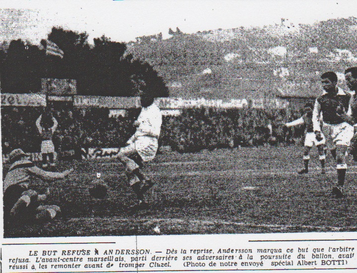 SETE - Gunnar Andersson, hier matin, était allée se promener sur les quais sétois et il fut abordé par plusieurs supporters qui lui posèrent inimitable question : "Alors, Gunnar, ça va mieux, tu joueras cet après-midi ?" Le Mazarguais fit un signe de tête affirmatif et répliqua, sans grand enthousiasme : "Oui, je tiendrai ma place, puisque mes supérieurs le veulent, mais je vous assure que je ne me sens pas en très bon état... Je souffre encore !" Gunnar avait-il un pressentiment ? Peut-être... Toujours est-il qu'il ne fut pas très gâté au cours de cet étonnant choc des seizièmes de finale. Il réussit un but à la 46me minute, qui fut refusé pour hors-jeu. Il tira une fois sur le montant droit de la cage de Cluzel (40me) et il fut expédié violemment au sol sur une charge de Loiseau à la 37me minute. Sombre dimanche, pouvait-il fredonner en reprenant cette vieille et célèbre chanson... |