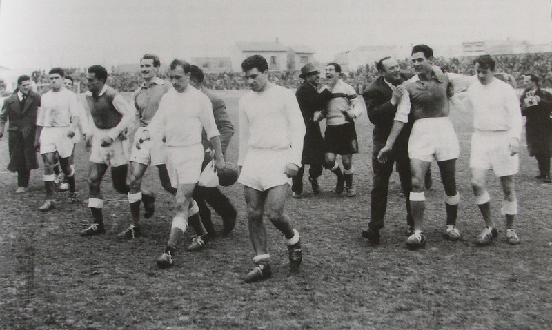 Dans les vestiaires Perpignanais régnait la joie la plus complète. C'était même du délire. On s'embrassait, on trépignait, on pleurait de ravissement. L'entraîneur Pierre Sinibaldi ne partageait pas l'euphorie générale, du moins il n'extériorisait pas son contentement : "Je suis évidemment ravi, je pense que nous avons fourni le meilleur jeu. Mais c'est dommage pour l'O.M. et j'aurais préféré me qualifier contre une autre équipe !" Loiseau, le capitaine, était fort satisfait et nous confia : "Nous avons opéré comme il le fallait le faire... nous avons étouffé les blancs et je n'ai jamais douté de la victoire après le premier quart d'heure !" Le gardien Cluzel nous fit remarquer : "En dehors du penalty je n'ai-je pas eu beaucoup de travail. Et d'ailleurs ce penalty était réellement sévère !" L'ex-Nîmois Boulle était radieux en s'exclamant : "Quelle belle journée, vraiment en entrant sur le terrain, nous ne pensions pas réussir un tel exploit". Enfin M. Aulas, l'un des dirigeants catalans, résuma, sa pensée avec infiniment de franchise : "Tous nos hommes ont été formidables et je crois qu'ils ont droit à des louanges unanimes, car n'oublions pas que nous avions abordé cette rencontre avec plusieurs absents de choix, tel qu'Inesta, Bosch, Mimouni. Mais Pierre Sinibaldi a été remarquable, il a su mener ses hommes à la victoire de façon merveilleuse..." |