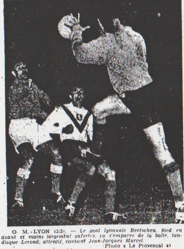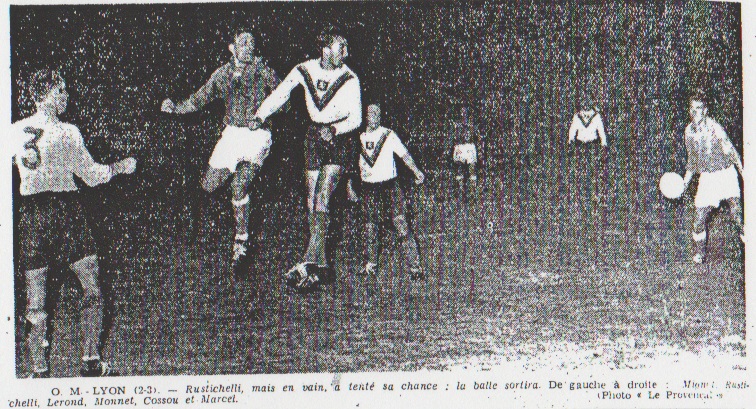 Après un excellent lever de rideau qui a opposé les amateurs de l'O.M. aux Dracénois pensionnaire de C.F.A., lever de rideau qui s'est soldé par un score nul (3-3), les équipes de Lyon et de Marseille pénètrent sur le terrain dont le pourtour est plus que convenablement garni. Les locaux arborent de splendides maillots rouges et après l'examen de plusieurs ballons les hostilités commencent. MORESCO marque Sans attendre, relayé par Moresco, Cossou place un tir qui ne surprend pas Domingo puis, après un coup franc au bénéfice de Leonetti, Antonio place successivement deux tirs impressionnants de puissance. L'O.M. répond et à la minute 4, Marcel dévie de la tête, vers Leonetti, un centre de Scotti. Beetschen et à l'ouvrage. À la 6me minute cependant, Moresco trompe Gransart et bat superbement Domingo à bout portant. La vitesse du jeu déjà rapide est encore accentuée par la lumière artificielle et le public vibre. Shoot de Leonetti. À la 10me sur coup franc de Scotti, Leonetti amortit calmement et décroché un tir terrible. Le goal Lyonnais plonge et des deux mains, renvoie. Le jeu est équilibré et si Lyon domine au centre du terrain, les attaques volent d'un camp à l'autre. Mais elle manque de spontanéité et c'est la raison pour laquelle ni Domingo, ni Beetschen ne sont réellement alertés. À la 16me minute, Leonetti ne coche, en coin, un tir très dur et le keeper visiteur n'a d'autre ressource que de concéder un corner qu'il donnera rien de positif. L'efficacité de l'éclairage laisse quelque peu à désirer et les approximations techniques se multiplient. À la 25me minute, Andersson réussit une reprise de volée. Le goal n'a pas à intervenir, la balle rate l'objectif. Le coup de botte de Scotti A la 30me minute, Scotti donne admirablement un coup franc, Marcel reprend d'un heading spectaculaire mais Lyon profite d'une nouvelle faute pour dégager et sur sa lancée, inquiéter Marseille par un boulet de Moresco. Domingo fort heureusement veille calmement. Trois minutes plus tard, Andersson rate de peu le cadre blanc puis Domingo se distingue encore sur un shoot de Levandowicz servi par Moresco. |