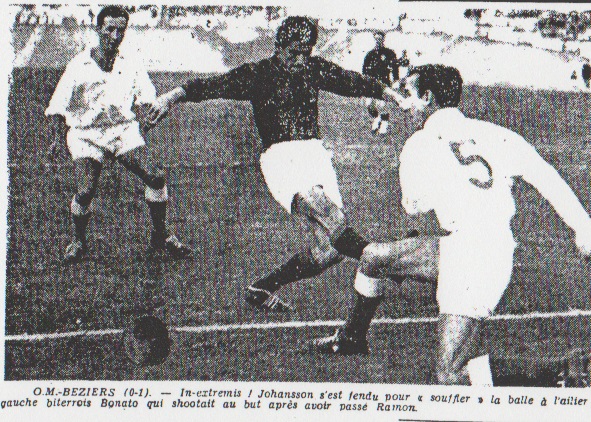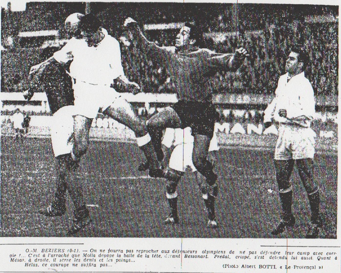 Bruneton à mon avis, valut plus par sa volonté de dominer les évènements que par son efficacité proprement dite. Il dut se ressentir de sa blessure de Monaco et puis, deux matches en 48 heures, n'est-ce pas trop pour un garçon de son âge. Mais sa sortie n'en demeure pas moins satisfaisante. La ligne d'avants manqua d'un animateur. Leonetti et Alauzun furent courageux, mais ne purent jamais arriver à mettre en position idéale leurs avants de pointe. Si Rustichelli fut, nous l'avons dit, le seul à donner des espérances, Jensen ne put jamais passer Delhaye, ni Sieber. Il se fit prendre bêtement une balle à 1 mètre des buts. Enfin, Andersson joua les hommes invisibles en première mi-temps, pour effectuer quelque centre anodin en seconde du poste d'ailier gauche... On voit que tout cela n'est pas bien convaincant... Béziers, par un petit but... En face d'une équipe olympienne invertébrée, Béziers ne domina pas les événements, loin de la... Les Héraultais furent plus dangereux, dès que Bessonnart, effacé à l'aile, se mit à effectuer de longue dangereuse ouverture. Une de celles-ci à Bonato permit à l'ailier gauche d'effectuer le centre décisif. En dehors de cela, Garofalo peu sûr, déçut quelque peu. Les arrières valurent plus par leur courage que par leur valeur propre, qu'il s'agisse de Delhayes, Sieber ou Rodzielski... Guilcher, demi, énergique, bien hier, rude, à la bonne frappe de balle fut infiniment supérieur au flegmatique Pujol. Nous avons parlé de Bessonart avec lui Luzi, mobile et décidé donna du mal à la défense marseillaise... Stojaspal est toujours adroit et clairvoyant, mais nous ne pensons pas qu'il soit le messie pour Béziers. Enfin Tagliagossi et Bonato furent assez réguliers contrés par Ramon et Johansson. Si nous avions à conclure, et à définir ce que fut la victoire biterroise nous dirons : Au royaume des aveugles, c'est une équipe borne qui a gagné ! Louis DUPIC |