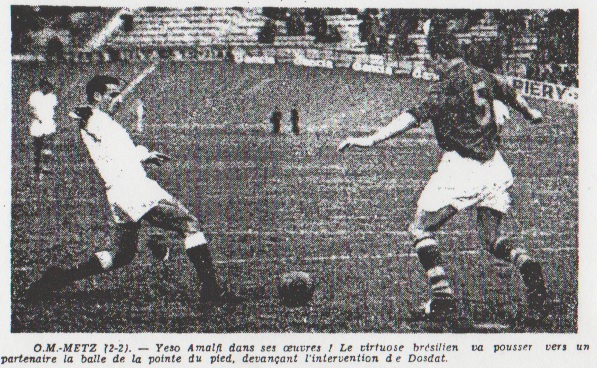 L'O.M. était évidemment insatisfait d'un match nul concédé au F. C. Metz le jour même de l'incorporation de Yeso Amalfi. Écoutons quelques sons d'une même cloche : Jean ROBIN : "Nous aurions du, en première mi-temps, prendre plus nettement l'avantage à la marque. Je suis persuadé qu'alors, Metz n'aurait pas trouvé les ressources morales qui lui ont permis de nous harceler et finalement, de réussir un score nul sur lequel, sans doute, les Lorrains eux-mêmes ne comptaient pas avant le coup d'envoi..." M. ZARAYA : "Béziers, Valenciennes et Alès ont perdu ? Et après ? Cela ne suffit pas à mon bonheur. J'espérais bien qu'aujourd'hui nous réussirions enfin à nous imposer. "Je me demande quels moyens il faut employer à l'avenir..." Roland PREDAL : "Le premier but messin était hors-jeu, je vous l'assure. Quel temps de chien, aussi, pour jouer au ballon !" Pour Jean-Jacques MARCEL, à propos de ce but, l'arbitre était.. dans le coma !... sans quoi bien sur, il aurait sifflé la faute. Yeso AMALFI, enfin, expliquait : "Il était très difficile de jouer sur ce terrain imprégné d'eau et devant une équipe de Metz absolument déchaînée. |