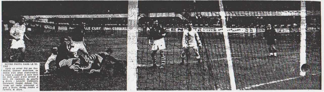 Maurice Gransart au troisième rang seulement pour une ou deux mauvaises interventions et aussi parce que les Messins percèrent le plus souvent de son côté, sans qu'il ait fait un mauvais match. Jean-Jacques Marcel, comme contre Reims, adopta une attitude défensive, mais en ce permettant plus de contre attaques, dont certaines ne furent arrêtés qu'au prix d'irrégularité. Bruneton, bien placé, lucide, adroit ne va pas aux chocs, ce qui est normal. Ce n'était peut-être pas l'homme qu'il fallait opposer aux rudes lorrains. Bon ANDERSSON Des avants, nous avons parlé déjà de Rustichelli qui est une attraction, mais qui, redisons-le, pour la vingtième fois, ne tire pas partie de ses immenses qualités. Amalfi n'a pas déplu, mais il n'a pas enthousiasmé. Tout ce qu'il a fait était bien fait, mais il nous a laissé sur notre faim. Gunnar Andersson, au courage qu'il manifeste depuis quelque temps, ajouta l'efficacité, et on peut le mettre au nombre des bons acteurs du match. Leonetti complique maintenant beaucoup trop son jeu. Il s'est fait ravir, par sa faute, de nombreuses fois la balle. Que ne profite-t-il pas de son excellente frappe ? Jensen travailla sans connaître sa précédente réussite, mais confirme ses progrès et sa bonne condition actuelle. Les Messins valurent plus par leur courage, leur énergie dans la dispute de la balle que par leurs prouesses techniques. Certains apparurent même comme assez maladroit. Aussi les plus complets furent-ils le très bon gardien Corazza, l'intérieur Zenier, habile et adroit, et l'avant-centre Acosta, excellent tireur, subtile et remuant. En résumé, les olympiens déçurent leur public qui s'attendait à les voir triompher nettement, qui le crut ferme en première mi-temps et qui, finalement tomba de haut ! Louis DUPIC |