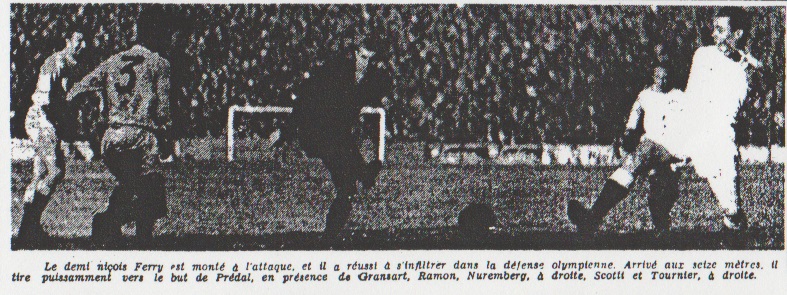 La foule hurle son mécontentement à M. Devillers, plein d'autorité dans des décisions à contre-sens qui n'avantagent personne, mais énervent tout le monde. Foix et Barrou décident Le jeu reprend et Gransart arrête opportunément Nuremberg pour transmettre en retrait à Predal. Rustichelli est passé ailier gauche et Jensen a pris sa place. Nice se fait de plus en plus pressant et une envolée de Predal dans les jambes de Nuremberg (40me minute) s'avère insuffisante : Gransart doit sauver. À la 50me minute, Molla, indécis, laisse partir Nuremberg. Le Luxembourgeois centre en direction de Foix et l'ailier droit des Aiglons n'a aucune peine à battre Predal : Nice 1 ; O.M. 0. Le temps de remettre en jeu, et de faire voyager la balle au centre du terrain et Uljaki, profitant d'une faute de Molla, réussit un retourné et sollicite Barrou au point de penalty. Le Noir se lance, Predal hésite, sort. Trop tard. Le shoot de l'avant-centre local a devancé l'action du gardien visiteur et c'est moins de 60 secondes après l'ouverture du score le second but des "rouges et noirs". Nice 2 ; O.M. 0. Muro confirme L'O.M. va-t-il réduire le score ? On le croit lorsque Amalfi de près, va tenter sa chance. Mais il rate son tir du gauche (54meminute) et à la 59me minute, au contraire, Uljaki prend son élan sur un coup franc de 20 mètres. Il décoche un bolide. La balle rebondit sur le mur, arrive à Muro. L'Argentin s'empresse de battre Predal pour la troisième fois. Nice 3 ; O.M. 0. A la 62me minute, Nuremberg ajoute un nouveau point. Il est hors-jeu et la marque en restait là malgré une domination on ne peut plus nette des locaux. Il y a plus qu'une seule équipe sur le terrain, mais Lamia doit s'effondrer sur le ballon catapulté par Andersson (63me minute). Predal sauve encore, sur un tir trop mou pour faire un but imparable, de Muro (65me minute). Andersson et Barrou bottent l'une et l'autre au-dessus (66me et 67me minute). Puis on relève jusqu'à la fin de dangereuses actions niçoises : Predal s'envole dans les pieds de Nuremberg (72me minute) et repousse en tombant devant Foix (77me minute) ; Nuremberg déclenche un beau tir alors que Predal est masqué (79me minute). Uljaki rate l'objectif de peu (81me minute) et Nuremberg de la tête, l'imite (83me minute). Uljaki porte un bolide à son actif (86me minute). Tout cela pour une seule action marseillaise signée par l'invalide Rustichelli dont le gauche n'inquiète pas Lamia (88me minute). Une dernière tentative de Muro et c'est l'acquittement d'une note qui eut pu être infiniment plus sévère. |