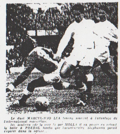 Les Stéphanois ont subi à Marseille, devant l'O.M., leur deuxième défaite de ce championnat et on peut dire qu'ils auraient mérité vraiment d'y échapper... Ils connurent en première mi-temps la loi des joueurs marseillais qui jouaient avec beaucoup de détermination et menaient les attaques les plus dangereuses, les plus directes. Si les Olympiens baissèrent le pied en seconde mi-temps et furent malmenés à leur tour, c'est que les champions accélérèrent quelque peu le rythme pour refaire leur retard, mais aussi parce que Gunnar Andersson, victime d'un profond claquage à la cuisse, dut se résigner à jouer les figurants à l'aile gauche, alors qu'il avait jusqu'alors montré beaucoup d'activité, allant jusqu'à disputer, avec succès parfois, des balles de la tête... Les Marseillais Cette équipe marseillaise renouvela devant Saint-Étienne la bonne sortie qu'elle avait accomplie devant Alès, et qui nous avait fait faire une restriction en raison de la faiblesse des cévenols. Hier, Andersson et ses camarades surent encore se créer nombre d'occasions. Deux buts leur furent refusés pour des hors-jeu discutés... et il n'aurait pas fallu grand-chose pour qu'ils soient valables. Mais cela créa une ambiance sud-américaine dans le stade. Predal eut quelques hésitations ; il fut faible sur les corner en seconde mi-temps, mais sauva son but sur un tir de Goujon. Gransart mis dans sa poche Nyers, très faible, et qui rata, à deux mètres du but, une occasion en or. Marcel fut très bon. Il avait pourtant affaire à Njolea, qui est bon technicien, souple, rapide et remuant. Il était seul capable de remonter un adversaire de cette classe, comme ils le firent à plusieurs reprises. |