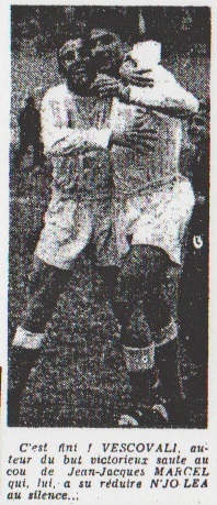 QUAND Saint-Étienne donne le premier coup de pied dans la balle, la foule respire enfin : M. Bois, en libérant les deux équipes ôta un poids aux spectateurs venus là avec la conscience d'assister à un match historique rendu capital par ses conséquences. Quelques minutes de jeu au milieu du terrain donnèrent bien impression que les 22 acteurs jouèrent une partie décisive, en évitant de s'engager à fond. On applaudit une belle action de Bruneton, on encouragea N'Jo Lea, sportivement, pour sa finesse de son travail... Et puis, on nota (5') un essai d'Olekziak. Le public s'enflamme A la 8me minute, c'est beaucoup plus sérieux : Wicart stoppe Vescovali au prix d'une intervention litigieuse et les 26.000 présents, comme un seul homme, se dressent pour réclamer - vainement - le penalty. Six minutes plus tard, sur un dégagement de Wicart dans les pieds de Vescovali, le centre de l'ailier Corse parvient à Curyl, qui, malgré un plongeon d'Abbès, marque. M. Bois, en refusant le point pour hors-jeu, transforme l'enthousiasme des supporters locaux en véhémentes protestations. À la 19me minute, sur sa lancée N'Jo Léa, de l'épaule bouscule Predal, possesseur de la balle, et, moins de 60 secondes après, Marcel arrête N'Jo Léa de façon nettement irrégulière... Le "climat" est créé. Le rythme du jeu, l'ardeur follement déployée de part et d'autres font le reste. |