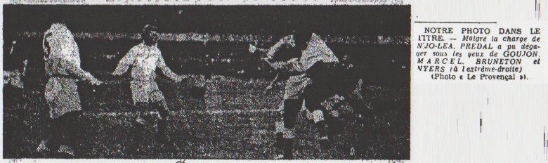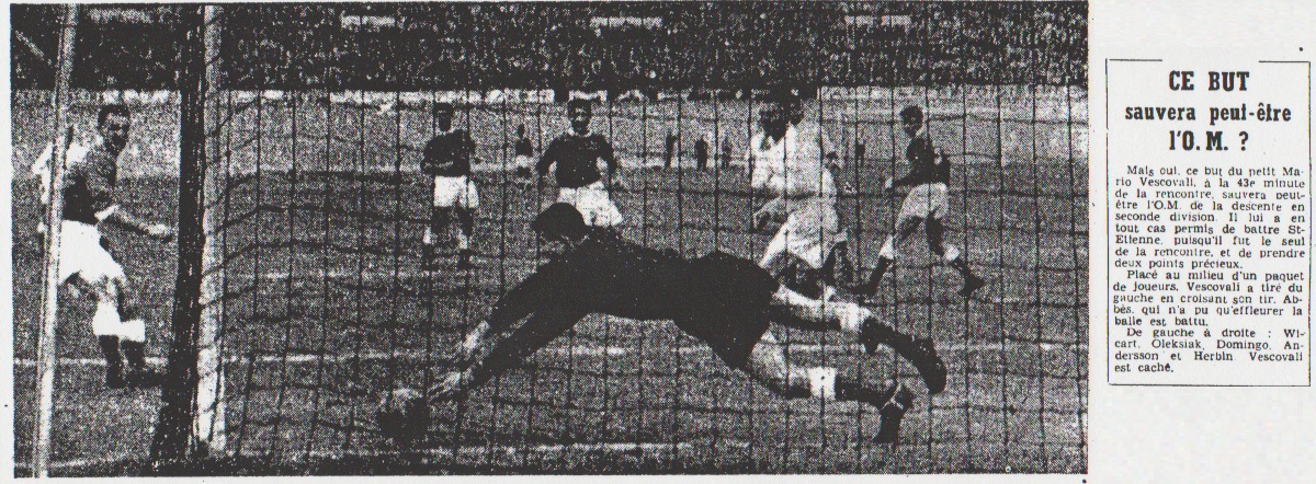 Deux fois 1 but à 0 et deux fois 2 points en une semaine ! La vapeur est-elle renversée ? L'O.M. a infligé à Saint-Étienne sa deuxième défaite de la saison et enregistrée du même coup une quatrième victoire beaucoup plus significative que la troisième vieille à peine du dimanche précédent. Inutile de préciser qu'au terme des 90 minutes, les héros étaient fatigués ! Dans un coin du vestiaire, séchant ses larmes, M. Zaraya se contenta de nous dire : "Je crois bien que cette fois nous tenons le bon bout et pourtant nous n'avons pas fini à onze... mais c'est égal voilà encore un but qui vaut deux points !" Pour M. Zilizzi, le passage à vide de la fin du match n'est pas alarmant : "Vous verrez que nous arriverons à faire de Vescovali et de Bruneton d'indiscutables titulaires". Jean-Jacques Marcel était évidemment radieux comme tout le monde avec une seule restriction : "Je n'aime pas jouer arrière central.. On y est esclave de trop strictes consignes...". Comme nous comprenons l'impétueux Brignolais ! |