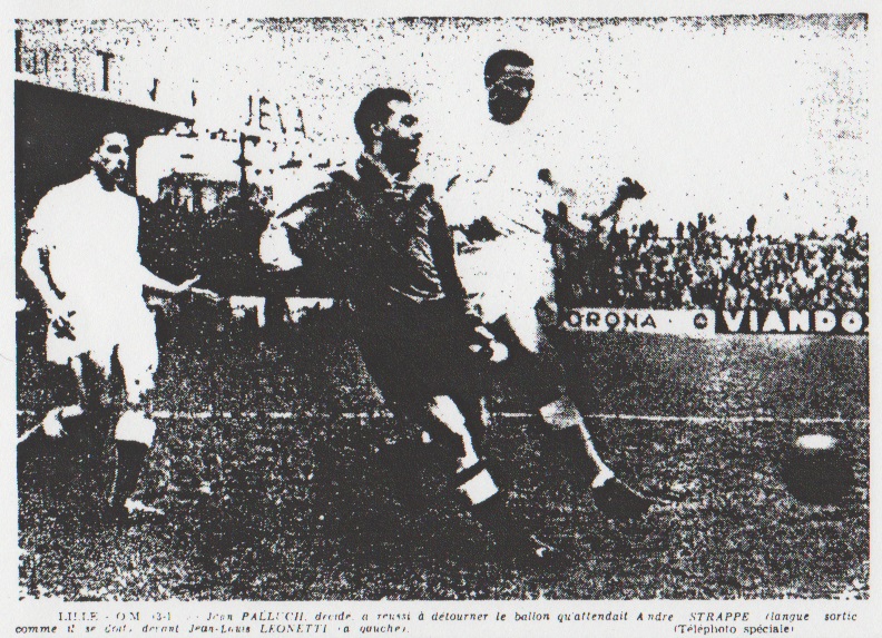 À Marseille, c'est Alauzun qui est laissé sur la touche, ce qui nous donne l'équipe suivante : Domingo, Gransart, Palluch, Mesas, Marcel, Molla, Rustichelli, Leonetti, Amalfi, Jensen, Curyl. Le temps est gris et froid et l'assistance clairsemée. C'est Duffuler qui est le premier alerté sur un shoot à mi-hauteur des 25 mètres de Leonetti. Sur leur lancée, les Marseillais dominent et l'on note un centre shoote de Rustichelli et un envoi de Molla à côté avant que Lille ne se dégage pour obtenir deux corners coup sur coup. À une attaque de Rustichelli stoppait par Delepaut, en succède une autre de Lille que Molla brise nette. Le jeu est agréable, mais manque de rythme. Le premier exploit de la rencontre est signé par Jean-Jacques Marcel. L'international descend 40 mètres balle au pied et sert Leonetti, lequel lance Jensen. L'ex-Lillois tire très bien et en force mais sur Duffuler. Cet assaut à quelque peu dégarni le camp marseillais et Lille en profite pour contre attaquer avec soudaineté. De Heutte la balle passe à Viaene, qui centre. Et d'une tête plongeante Devlaeminck marque. Il y a 5 minutes que l'on joue. Marseille ne paraît pas décourager. Il se rue à l'assaut du but lillois. Les Nordistes font replier leurs inters et sont obligés d'accepter la domination adverse, laquelle n'est malheureusement pas ponctuée d'essais au but. En voici pourtant deux de Jensen, l'un nettement au-dessus, l'autre aura du poteau. Mais Duffuler était à la parade sur ce dernier. Lille ne se donne que rarement de l'air et quand il parvient il ne s'embarrasse pas de fioritures et utilise les longs coups de botte. Sur une échappée lancée dans ce style, Devlaeminck adresse un boulet que Domingo repousse d'une manchette. Heutte surgie et marque (33me minute). Tandis que la balle et au fond des filets, Domingo demeure à terre. On le relève l'épaule droite démise et, après une interruption de trois minutes pour trouver un maillot Mesas prend place dans la cage. Ce dernier va s'illustrer avant le repos en détournant superbement en corner un shoot de Strappe sous la barre. À la reprise, Jensen joue ailier droit, Rustichelli avant-centre, Amalfi inter et Leonetti demi. Ces dispositions vont être ensuite totalement bouleversées après une intervention, d'entrée de Duffuler dans les pieds de Jensen. Mesas devient la grande attraction du match. Par un shoot de Heutte et met à son actif deux sorties opportunes pour dégager du pied au-delà des18 mètres. La cadence du jeu se ralentit encore. Lille rate tous ses shoots et Marseille l'imite. Duffuler n'est vraiment mis à contribution qu'à trois ou quatre reprises sur des tentatives de Rustichelli (50me minute), Marcel (62me), Jensen sur coup franc (64me). Tandis que Mesas se fait encore applaudir en concédant deux corners sur des shoots difficiles et appuyés. On croit le verdict acquis lorsque, à la 85e minute, le valeureux Mesas est fusillé à bout portant par Bourgeois, alerté par Heutte. Quelques instants auparavant Gransart, seul devant Duffuler, avait raté une belle occasion. Palluch, à 30 secondes de la fin, ne l'imitera pas. De très près, il sauvera l'honneur pour son équipe, ramenant le score à de plus raisonnables proportions. |
