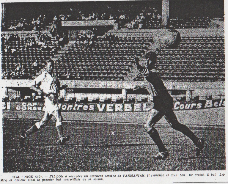 Déjà handicapé par la triple absence de Milazzo, Nuremberg et Muro (trois valeurs sûres), comme par hasard, l'O.G.C Nice dut se passer au dernier moment des services du noir Barrou. L'entraîneur Jean Luciano fit ainsi appel à Jacques Foix pour tenir le poste d'avant-centre, le jeune Vergé portant le n.7 à la place de l'ex-Stéphanois. Tillon opportuniste, mais... Après quelques minutes d'observation, comme s'il s'agissait du début d'un combat de boxe ou les deux antagonistes se surveillent, sachant qu'un coup peut-être décisif, la balle parvint à Farmanian. L'ancien pensionnaire de l'A.S. Aix alerta prestement Tillon, alors en position d'ailier gauche. Le blond avant-centre marseillais maîtrisa la balle d'un coup de patte, la ramena à terre et s'enfuit en la conduisant, bien couverte. Au moment ou chacun - à commencer par Lamia - s'attendait à la poursuite de ce raid par un centre, Pierre Tillon déclencha un tir croisé qui, surprenant le keeper azuréen, le laissa pantois. Le score était ouvert. Maints spectateurs virent Tillon en position de hors-jeu. Les Niçois affirmèrent bien que le point n'était pas valable. Mais après la rencontre, seulement. M. Becret en tout cas - qui eut le tort de répondre aux propos forcément acerbes des joueurs après le match - indique le centre du terrain. L'affaire était dans le sac : l'O.M. sur la malchance duquel on s'apesantit volontiers, bénéficiait d'une monumentale erreur pour ouvrir le score. Enhardis (on le serait à moins) les Marseillais faillirent, par Tillon, qu'un heading de Chicha avait mis en possession du ballon, aggraver la marque : seule une cabriole aussi spectaculaire qu'audacieuse de Lamia - excellent hier - annihila cette tentative. Et si à la 12me minute, Gransart inscrivit à son passif une passe pour le moins hasardeuse, à Fischbach, Lamia dut se détendre horizontalement à la 14me minute pour capter un centre de Farmanian. |