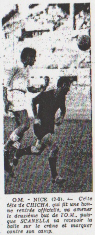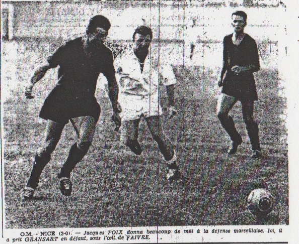 Gransart superbe A la 19me minute, Gransart devait effacer le souvenir de sa faute : Foix, d'un lobe admirable d'adresse, avait rendu inutile la sortie de Fischbach accouru à sa rencontre. La balle filait entre les poteaux lorsque le puissant défenseur réussit un retourné acrobatiques. Ouf ! Le spectre de l'égalisation réveilla sans doute l'amour-propre des locaux car ceux-ci, qui dominaient depuis le début, accentuèrent encore leur pression. Scanella s'affolle A la 21me minute, Amalfi tira à côté. Alba et Ferry en firent autant. Mais un avec moins de conviction. À la 39me minute, débordé, le demi gauche Scanella mis à contribution par un centre d'Amalfi destiné à Chicha, perdit son sang-froid : il ne laissa à personne le soin de battre l'infortuné Lamia, loin de mériter un pareil sort. Gonzales expulsé C'en était trop. En seconde mi-temps les Niçois ayant compris qu'ils ne gagneraient pas, l'intérêt du jeu déclina. Leonetti plaça bien (62me minute) un bolide dans la trajectoire frôla la barre, Eschman (68me minute) obligea bien Lamia a sauvé en "récupérant" la balle derrière lui, mais l'enjeu n'hésitait déjà plus. À cinq minutes de la fin, le public explose pour "appuyer" M. Becret désireux de voir Gonzales (très bon mais trop souvent à la limite de la correction) regagner les vestiaires à la suite d'un incident provoqué par une rencontre Gonzales - Tillon sur laquelle le référée sembla accorder penalty... avant de siffler coup franc contre le Marseillais. Ainsi se termina le match qui ne fera pas date et dont l'essentiel réside dans les deux points glanés par l'O.M. Georges LEOST |