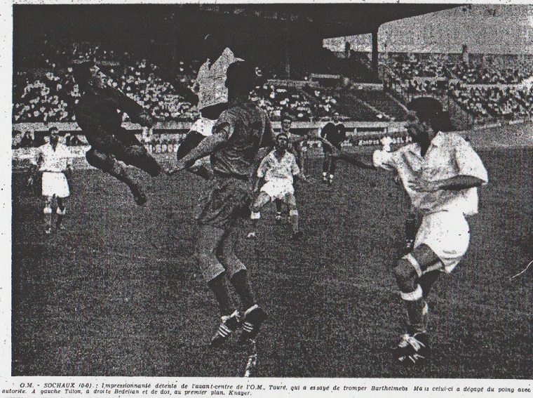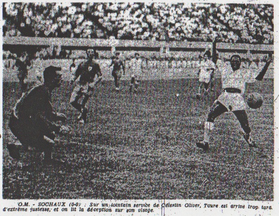 Parce que l'on attendait une victoire des olympiens, le match nul dont ils ont dû se contenter hier sur leur air du Stade-Vélodrome, à l'occasion de la venue du F.C. Sochaux, a constitué une déception pour les supporters locaux. La rencontre avait d'ailleurs débuté sur une note pessimiste, l'arrière Bedelian - promu ailier gauche - bottant maladroitement derrière la cage de Barthelmebs un corner obtenu d'entrée par le noir Touré. L'empreinte de FISCHBACH A la 3e minute, comme pour démontrer que l'on pouvait compter sur lui, Camille Fischbach pris des risques énormes (il n'avait d'ailleurs pas le choix...) en plongeant devant Brodd que l'autre noir, Edimo avait astucieusement lancé. Trois minutes plus tard, en déséquilibre, "Bako" Touré tenta un shoot difficile. Il le rata, donnant ainsi un avant-goût de ce qu'allaient être, les essais des marseillais jusqu'au coup de sifflet final : autant d'échecs. A la 11e minute, Amalfi ouvrait superbement sur Tillon mais le goal doubistes stoppa. Peu après, Stopyra réalisa une remarquable déviation, mais sans pour autant prendre en défaut l'excellent Fischbach puis sur coup franc Amalfi chercha vainement le front de Molla. À la 18e minute, Eschman travailla avec énergie - dans son style - pour mettre Tillon en possession du ballon. L'ex-Sedanais ne put que tirer derrière les filets adverses. Deux minutes plus tard, Touré décocha une balle vrillée que Barthelmebs ne maîtrisa qu'en s'employant réellement. BOURDONCLE pénétrant A la 22e minute, l'inter gauche Sochaliens Bourdoncle s'infiltra avec décision dans le réseau défensif phocéen et déclencha un tir terrible sur lequel Fischbach se coucha sous applaudissements du public qui "découvrait" le Forbachois. |