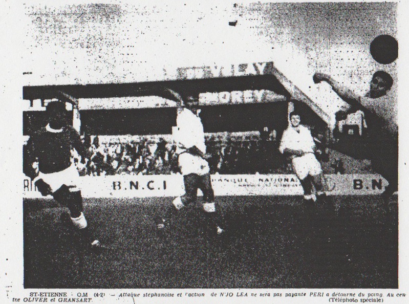 SAINT-ETIENNE (Par téléphone) - Le stade Geoffroy Guichard, entouré par de hautes cheminées, avait pris son air de fête comme pour recevoir dignement les joueurs marseillais. Un soleil très méditerranéen éclairait le tableau ou le vert de la pelouse contrastée avec le ciel sale et déchiré par des traînées de fumée venues des usines d'alentour. À la suite d'une conférence qui s'était tenue à midi, à l'hôtel du "Chevalier Noir", Jean Robin (remplaçant Louis Maurer, malade, rappelons-le) et M. Zaraya, avaient décidé d'utiliser les services de Jean-Jacques Marcel, mais de se passer de Chicha souffrant encore de la cheville. C'est ainsi qu'au coup de sifflet donné par M. Blum, entre deux ailiers et venues du pont roulant, servant de toile de fond, l'O.M. présente une ligne médiane, Marcel, Mallet, Oliver et un compartiment offensif Hédiart, Eschmann, Touré, Leonetti, Ikonga. Dès la première minute, les visiteurs manifestent leur intention de confirmer leur redressement par Marcel qui shoote sans inquiéter Abbès. N'JO LEA maladroit Après une belle descente, N'jo Léa récidive, et alors qu'il semble devoir marquer, glisse la balle à côté d'un rien. À la 4e minute, Braizat, échappé pour la deuxième fois à Mallet, botte sans précision. Mais à la 5e minute, Eschmann alerte Leonetti qui transmet à Ikonga ; Abbès éprouve quelque peine à maîtriser le ballon. La 6e minute, Leonetti tira encore le gardien forézien se couche. Après une sortie au pied de Péri sur corner de Goujon (8e minute), Touré décoche un bolide qui soulève des "ho" d'admiration, sans pour autant changer quoi que ce soit en score. A la 11e minute l'avant-centre marseillais se distingue encore. WICARD sauve A la 13e minute, Braizat s'avance seul devant Péri et shote. Le gardien phocéen arrête en deux temps. Hédiart passe à Touré qui sollicite Eschmann. Le Suisse, en tombant, pousse la balle hors de portée d'Abbès, mais Wicart surgit et dégage sur sa ligne. NYERS marque Mal contenu par Mallet N'Jo Léa s'approche de Péri, passe à Nyers, qui marque en coin malgré l'angle extrêmement réduit. Il y a 19 minutes que l'on joue. À la 22e minute, Coincon place un tir que Célestin Oliver renvoie alors que Péri a déserté sa cage. À la 25e minute, la suite d'un choc avec Ikonga, Goujon boîte bas et Braizat répond à un essai infructueux de Marcel. L'O.M., qui se crée davantage d'occasions que Saint-Étienne, les gâche par maladresses et précipitations, permettant à son rival de se dégager et d'inquiéter Péri. A la 33e minute, sur corner concédé par Leonetti et donnée par Goujon, Péri a toutes les peines du monde à s'emparer du ballon dévié in extremis par N'Jo Léa. À 37e minute, une combinaison Marcel Leonetti Ikonga Touré Marcel se termine par une tête de ce dernier, qui trouve Abbès à la parade. Une minute plus tard, Goujon lance Braizat. Péri lui plonge dans les pieds mais en vain et le leader d'attaque forézien aggrave sans difficulté le score. |