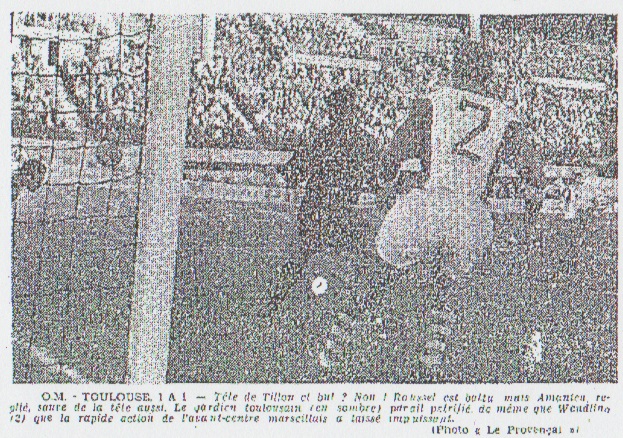 Le temps est couvert comme de bien entendu lorsque les équipes marseillaises et toulousaines s'apprêtent à "envahir" la pelouse. Une pelouse humide, c'est aussi compréhensible après la semaine pluvieuse qui a précédé la rencontre. Toulouse apparaît en blanc et rouge de l'O.M. en bleu. Le temps, lui, est toujours chargé de nuages gris et noirs. On voit, dès le coup d'envoi donné par Tillon, le même Tillon shooter à ras de terre à côté des buts de Roussel sur service d'Eschman. Réplique immédiate par Schultz qui met au-dessus, la balle éraflant l'horizontale. Ça promet ! Exploits de ROUSSEL La remise en jeu à peine effectuée, Eschman sert Farmanian dont le tir est cueilli par Roussel à la manière d'un plongeur de haut vol. Il y a à peine cinq minutes que l'on joue. Dégagement au pied de Fischbach devant Dorsini, puis nouveau centre shoot de Farmanian cueilli par Roussel. Toulouse obtient un corner sans le moindre danger pour l'O.M. qui reprend une laborieuse occupation du terrain toulousain. Une splendide ouverture d'Oliver (16me m.), sur Tillon, permet à ce dernier un sprint et un shoot repoussé de la main par Roussel. Un autre shoot immédiat d'Oliver et aussi repoussé au pied cette fois par le même Roussel, qui plonge encore avec succès sur un essai de Touré et sur un coup de tête du même Touré. Un corner pour Toulouse (27') tiré par Dorsini, est stoppé au milieu d'un paquet aérien de joueurs par Fischbach et, à la demi-heure, une course échevelée d'Eschman sur la gauche se termine par un centre shoot repris par... un défenseur toulousain qui met en corner. Roussel, sortit au devant d'Eschman était battu ! Un corner pour Toulouse et un coup franc pour l'O.M. à 20 m. ne donnent rien, puis, sans en avoir l'air, Touré (39') place impressionnant paquet que Roussel se content de repousser en plongeant. Ont ne peut pas reprocher aux 22 acteurs de ne pas se livrer, mais, chose assez curieuse, on ne semble pas l'imminence d'un but... ...Et au repos Fischbach ni Roussel ne se sont inclinés. Un zéro à zéro qui, cependant n'avantage pas l'O.M. |