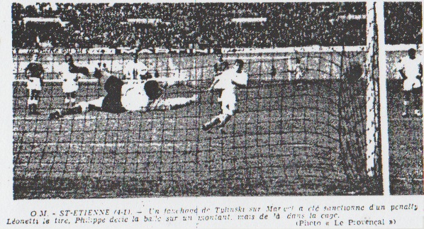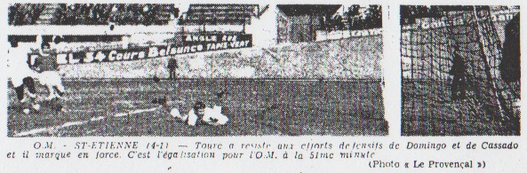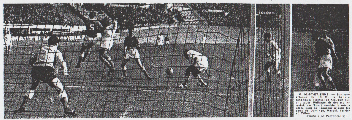 Une rencontre, qui devait se terminer dans l'euphorie, avait bien mal commencé pour l'O.M. puisque dès la première minute, Njolea glissait la balle entre les jambes de Bobik et aller jusqu'au but... pour échouer sur Tonda. L'O.M. domine Est l'O.M. avec une bonne volonté manifeste, allait envahir longuement le camp stéphanois. À la 3e minute, Vescovali, bien lancé par Leonetti, obtenait un but refusé pour hors-jeu ; puis un très dur shoot de Marcel était bien dévié par Philippe. D'ailleurs cette domination ne devait se traduire que par des poussées dangereuses, inquiétantes pour la défense des visiteurs, assez mal assurée... tout comme celle de l'O.M. Mais Saint-Étienne marque En effet, cette défense olympienne ou Bobik jouait blessé, on se demande bien pourquoi, donnait des signes très nets de perméabilité. À la 13e minute, Goujon lançait Peyroche qui seul, devant la cage tirait à côté. Le jeune Mitoraj l'imitait 8 minutes plus tard, mais il se rachetait à la 24e minute en récupérant une balle que Njoléa, bousculé par Molla, venait de perdre et battant Tonda de près. Changement de vue... Jusqu'à la mi-temps, rien de saillants ne se produisait. Aux fougueuses attaques olympiennes, Saint-Étienne répondait par des balles bien amenées. Après le repos changement radical ! Non seulement l'O.M. domina de façon écrasante un adversaire débordé par sa fougue, puis paraissant résigné, mais jouait en attaque de façon presque irréprochable. A la 49e minute, un centre de Vescovali était expédié de la tête par Toure, sur la transversale. Deux minutes plus tard, le même Touré, lancé par Tillon résistait à Cassado et marquait en force. À 60e minute, Tillon et Touré échappaient, en tandem, à la défense stéphanoise et Cassado, sur sa ligne, déviait la balle sur le montant ! |
