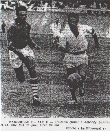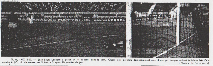 Personne ne pourra reprocher aux garçons de Germain Reynier et de Nicolitch de n'avoir pas joué avec loyauté ! C'est l'impression principale qui se dégage de ce derby provençal, premier du nom, et que l'O.M. enleva en vingt minutes de jeu. Certes Aix fut dominé et joua à quatre arrières. Mais ce fut bien plus en conséquence de la supériorité de l'O.M. que procédant d'une tactique préconçue. Une révélation : Manouélian Les premières escarmouches mirent en évidence un petit bonhomme trapu, brun, mais maniant la balle avec une habilité très grande pour un garçon de son âge : David Manouelian, qui mena la vie dure à Bruneton tant que Aix garda ces chances intactes. Après un heading de Durand et un tir sur le coté du filet de Celestin Oliver, Manouelian traversa, comme en se jouant, la défense marseillaise et donna la balle à Hesse bien démarqué à son aile gauche. Ce dernier déclencha sans contrôle un bon tir brossé qui trouva Peri à la parade. Sous l'impulsion de Manouelian, Sergent et bravo, Aix jouait agréablement donnant une plaisante réplique à l'O.M. et tout cela promettait une excellente rencontre. L'O.M. marqué à deux reprises Célestin Oliver allait ruiner les espérances aixoises. Tout d'abord à la 10eme minute. Il plaça un tir du gauche que Cluzel freina, d'abord, puis réussit à contrôler. Cinq minutes plus tard, Leonetti, servi par Ramon, trouva Oliver démarqué au point de penalty. Il sembla bien que la balle tendue, allait échapper au capitaine marseillais. Mais dans une détente de tout son être, en extension complète, il réussit à la frapper du gauche et à l'expédier en haut et à gauche hors de portée de Cluzel. Après ce premier but, l'O.M. continua à mener les opérations tambour battant. Tillon, de près, tâta d'abord une frappe facile du gauche. Peu après Aygoui, consécutivement à un beau travail de Durand et d'Oliver continué par un relais de Tillon, tira fort sous la transversale mais Cluzel dévia en corner. A la 30me minute, second but de l'O.M. Une passe au millimètre de Durand vers Leonetti au centre, une intervention ratée de Sergent et un tir du gauche de Jean-Louis qui alla se loger dans le coin à la droite de Cluzel. Le match était joué... Jusqu'au repos, la rencontre devait rester plaisante, deux coups francs d'Oliver aux 26me et 29me minutes mettant Cluzel à rude épreuve. Pour Aix, c'est Hesse qui rata d'un cheveu une belle ouverture, de Bravo après une demi-heure e jeu, puis expédia un bon tir en coin que Peri arrêta bien en plongeant. |