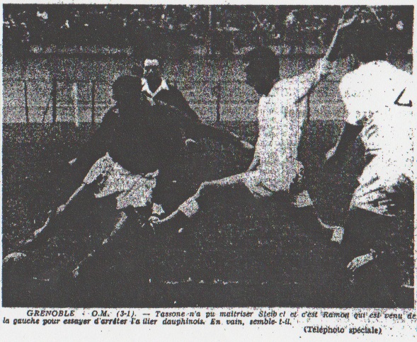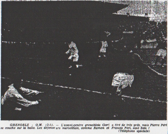 A la 30me minute, Valorizek, encore lui, échappe à Léonetti, centre - un très beau coup de pied d'ailleurs - Peri doit sortir mais il ne sort point et Steibel avant que la balle ne touche le sol, en profite pour la rabattre d'un coup de tête dans les filets marseillais. Deux à un, et ce n'est pas car, quelques minutes après, Geri et Desgranges manquent un but que le préposé au tableau d'affichage s'apprêtait déjà à inscrire. Ici, Péri a sauvé. Pendant ce temps, Leonetti, Molla et Tassone fournissent une besogne considérable. Les situations dangereuses pour l'O.M. se succèdent jusqu'à la mi-temps. Leonetti : des kilomètres Le match reprend. Changement radical. C'est l'O.M. qui a toutes les initiatives. Tillon quelquefois déborde, Durand est plus positif qu'en première mi-temps. Leonetti qui, depuis le début de la rencontre, court sans cesse, aura à ce train, couvert des kilomètres avant la fin du match. Il ravitaille ses avants de pointe pendant qu'à l'arrière les poussées offensives se préparent avec plus de mordant, plus de précision. On voit Oliver reprendre de volée un centre de Tillon. Son tir boulet est intercepté. On apprécie un coup franc remarquablement botté à 25 mètres des buts par Leonetti. On regrette un mauvais heading de Tillon sur un centre d'Oliver On respire - Tout cela quand on est Marseillais, bien sûr - lorsque Peri hérite finalement d'une balle qui, à trois reprises, s'était complue à danser dangereusement devant les buts marseillais, sur des tirs ou des interceptions de Cappon, Gori et Vidal. Sur un nouveau centre de Vidal, Péri bloque in extremis une balle donnée de la tête par Steibel. Pendant 25 minutes, Grenoble moins pénétrant, plus las, était encore à la portée des hommes de Troupel. Mais il est trop tard. Le onze alpin ne s'accorde plus de répit. Abad et Eschman se télescopent ; Eschman revient sur le terrain, mais Abad à la clavicule touché. Il jouera d'un bras. Ce qui ne l'empêchera pas d'éloigner un violent tir de Leonetti, qui prenait la direction de la lucarne. Moins heureux sera Peri, qui à la 34me minute, sur un coup franc tiré de la gauche, laisse échapper la balle. Cappon, qui apprécie les cadeaux de cette nature, reprend cette balle et marque le 3eme but. De nouveaux pétards éclatent alors que les olympiens continuent de lutter, et risquent même de marquer sur une tête de Durand. Mais il ne s'agit que d'actes gratuits. L'O.M. est battu sans discussion. Les Grenoblois n'ont pas ménagé leur peine pour cela. Et les sonnailles de reprendre leur chant dans les tribunes. |
