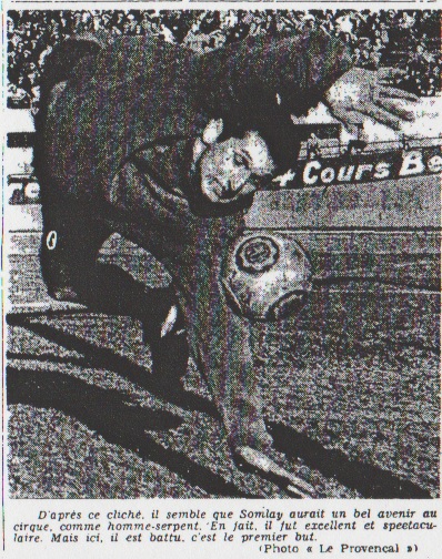 Il rattrapa cela à la 41me minute d'un "pointu" de 25 mètres qui toucha la transversale avant d'aller dans les filets. Nantes menait 2-1 au repos, à la consternation des supporters marseillais, consternation d'autant plus grande que Celestin Oliver avait manqué inexplicablement sa reprise, facile pour lui, d'un centre parfit d'Eschman (45me minute). Toujours des cadeaux L'O.M. revint très abattu sur le terrain et les Nantais eurent le tort de faire courir la balle et d'essayer de conserver l'avantage acquis plutôt que tenter de l'augmenter... D'entrée, Tassone donnait la balle à Collados qui se laissait rejoindre. Carpentier l'imitait et servait fort bien Moresco qui allait droit au but, mais tirait droit... devant lui, cinq mètres à côté. Nous étions à la 49me minute, Nantes conservait en général la possession de la balle. Une heure venait de s'écouler et Couronne manquait d'un cheveu la reprise d'un centre excellent de Collados. Eschman égalise Nantes s'affole... Comme les vingt premières minutes, les vingt dernières allaient être à l'avantage très net de l'O.M. qui n'obtiendra pourtant qu'un but par Eschman à la 72me minute, dans les circonstances suivantes. Braizat conserva la balle malgré deux adversaires peu acharnés à sa perte et centra haut. Une tête en retrait d'Oliver. Un dégagement manqué de Dereuddre et Eschman, habilement, plaçait un bon tir croisé qui faisait mouche. Evidemment, l'O.M. se rua à l'attaque et fournit une fin de match très méritoire. Mais derrière la défense bretonne bien groupée, le souple Somlay fit merveille et intercepta les nombreux centres ou balles en profondeur que les Marseillais adressèrent versa sa cage. Molla s'intégra même à son attaque sur deux corners successifs qui créèrent des cafouillages invraisemblables. Mais Somlay, chaque fois, en émergea avec la balle. Et ce fut un nul logique, l'O.M. mettant à son actif le début et la fin du match, Nantes la partie médiane. |