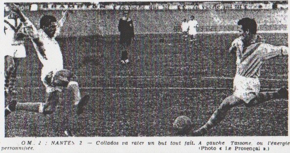 O.M. - Nantes ? Une rencontre dont le résultat nul ne saurait satisfaire aucun des deux adversaires. Dans leurs vestiaires respectifs, locaux et visiteurs faisaient tristement le compte des buts qu'ils n'avaient su obtenir et de ceux qu'ils n'auraient pas du encaisser... et on ne saurait leur donner tort ou raison. En fait, les défenseurs des deux camps laissèrent à leurs adversaires un nombre élevé d'occasions de buts que ces derniers refusèrent avec une obstination touchante. Proximité des fêtes de Noël inclinant à la mansuétude ? Sans doute. Notre tâche va presque se borner à tenir le compte des occasions offertes, acceptées ou refusées. Un bon début des Marseillais L'O.M. va dominer avec le vent. Dès la troisième minute, Aygoui, reprenant de volée un centre de Braizat, contraignit Somlay à une belle parade. Ce fut le premier cadeau. Aygoui se devait de tirer plus fort et plus juste. A la 16me minute, un tir lointain de Sbroglia aurait sans doute été stoppé par Somlay qui vit la balle détournée sur un montant par la tête de Samson. Celestin Oliver, toujours à la pointe du débat, ouvrit la marque. Nantes égalise échoue deux fois puis prend l'avantage C'était au tour des Nantais de jouer. Une ouverture de Schindlauer aurait sans doute été repoussée par la tête de Molla... et Corazza, mal inspiré, n'était sorti pour le bousculer. Couronne toujours habile et précis, remit les deux équipes à égalités (1-1), à la 26me minute. Bagatelles jusqu'à la 36me minute, où Moudio sert Couronne. Un travail magnifique du numéro 7 visiteur et Collados, à quelques mètres de Corazza, figé cette fois, rate un point immanquable. Trois minutes plus tard, Moudio dribble Tassone, évite Molla (revenu un peu groggy sur le terrain après 5 minutes d'absence), mais, déséquilibré place un tir imprécis. |