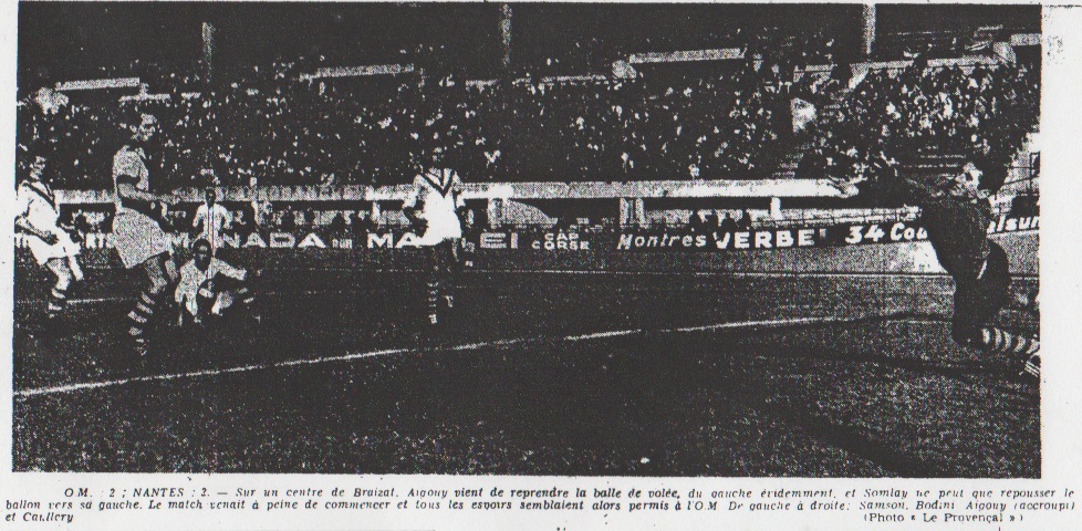 Ceci se passait peu avant la mi-temps. A la reprise, les Nantais, maîtres du jeu pendant les premières vingt minutes, commirent l'erreur de vouloir vivre sur cette avance, en se contentant de faire courir le ballon... ... Et l'inévitable, en pareil cas se produisit, l'O.M. égalisa et termina la rencontre au sprint. Mais combien laborieux, pour les Marseillais, avait été ce match nul, qui leur permet, cependant de rester dans la course. Du mauvais O.M. A l'issue de la rencontre, les opinions sur les joueurs de l'O.M. étaient très partagées. Disons, pour être juste que c'est l'équipe dans son ensemble qui a joué sans style et sans personnalité. Ses meneurs de jeu habituels, Eschman et Oliver, ont sombré dans le désordre ambiant ; et même le calme Corazza n'est pas exempt de reproches. Nous pensons surtout, à ce fâcheux dégagement au poing, en seconde mi-temps, indigne de la casse du gardien ex-messin. Nous n'insisterons pas trop sur la faiblesse de Moresco, sur la lenteur de Braizat au demeurant bon technicien, sur l'imprécision des demis et des arrières, tellement ces faits parurent patents. Ce n'est pas en jouant de cette façon que l'O.M. à la moindre chance de "monter". A Nantes, Carpentier, Samson, Dereuddre, Schindlauer, Couronne et Moudio émergèrent, dans un ensemble de bonne valeur pour la Deuxième Division. Maurice FABREGUETTES. |