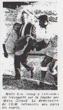 Nous commencerons par la réflexion finale d'un de nos voisins. "Ils s'en tirent bien ! " Ils n'étant pas les Nantais qui venaient d'arracher un point en déplacement, mais les Olympiens qui venaient de perdre un nouveau point sur leur terrain. La rencontre avait pourtant bien commencé pour l'O.M. Dès la 3me minute, sur un centre de Braizat, Aigouy décochait un bon tir du gauche : et un peu plus tard, Sbroglia, trompant Somlay d'un tir d'environ 25 mètres, permettait à Célestin Oliver de marquer le premier but de la partie. Un chef d'oeuvre de pagaille A ce moment là, on ne donnait pas cher des chances de Nantes, tellement sa défense, à l'exception de Carpentier, paraissait peu sure. Le grand Caullery et le trapu Balloche multiplié les erreurs en tous genres et Somlay semblait incapable de bloquer une balle. Mais, petit à petit, on s'aperçut que le jeu des visiteurs sous l'impulsion de Schindlauer, de Dereuddre, de couronne et du demi-gauche Samson, était plus précis, plus technique que celui des Marseillais. Par suite, on vit les défenseurs marseillais, sauf Molla, ne pas mieux savoir que leurs collègues nantais où donner du pied et de la tête. Ce qui nous valut un petit chef-d'oeuvre de " pagaille" le but égalisateur de Nantes. Corazza, Tassone et Molla, ce dernier k.o. couchés les uns sur les autres, tandis que Couronne glissait la balle dans la cage vide. Un mal nul laborieux Les Nantais, après avoir manqué, miraculeusement pour l'O.M., deux buts, en marquèrent finalement un autre d'apparence plus difficile grâce à leur avant-centre noir Moudio. |