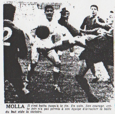 L'O.M. pourtant avait été accueilli, à son entré sur la pelouse du Stade Vélodrome, par une véritable tempête d'applaudissements et de cris d'encouragement divers. Les "Maillots blancs" venaient-ils de gagner la finale de la Coupe ? Non point, simple réponse du berger à la bergère. Passablement énervés par les pétards et les coups de clairon des supporters grenoblois, les spectateurs marseillais tinrent à démontrer qu'ils savaient, eux aussi, créer un climat très sud -américain, à l'occasion. Et ils y réussirent parfaitement. L'ordre contre le désordre Mais, s'ils purent, grâce surtout à la loi du nombre, dominer nettement la chorale de l'adversaire, ils furent incapables de communiquer leur enthousiasme, leur désir de victoire, aux onze joueurs qui les représentaient. Il ne fallut pas, en effet, plus d'un quart d'heure, pour s'apercevoir que l'affaire serait chaude pour les hommes de Lucien Troupel. D'un coté, celui de Grenoble, il y avait une équipe pas géniale, certes, mais sure en défense, suffisamment précise au centre du terrain et complétée en attaque par deux ou trois joueurs rapides, bons dribbleurs et sachant exactement ce qu'ils avaient à faire. En somme, une bonne équipe de deuxième division, parfaitement organisée, harmonieusement construite. De l'autre, celui de l'O.M., one joueurs, dont la bonne volonté n'est pas en cause, mais qui paraissaient se chercher sur le terrain et affligés, pour la plupart d'entre eux, d'une désespérante lenteur dans la course et dans le maniement du ballon. D'un côté, l'ordre et la précision ; de l'autre, le désordre et l'imprécision. Corazza méconnaissable Dans de pareilles conditions, seul un miracle pouvait sauver l'O.M. |