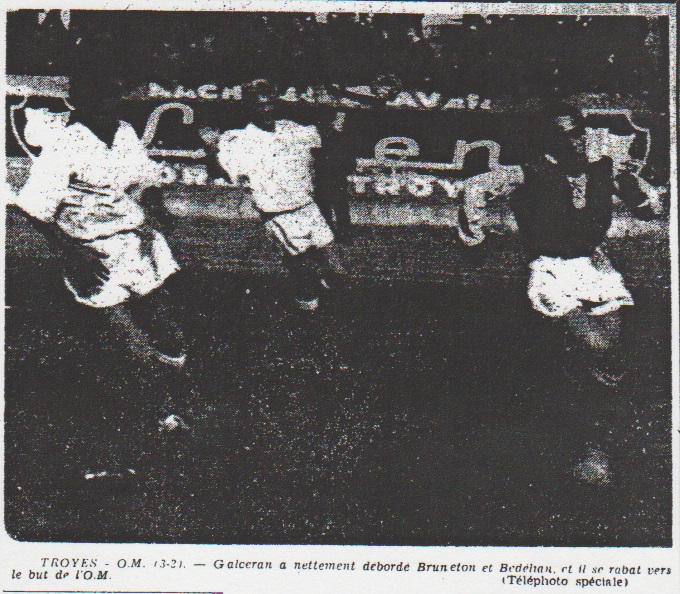 Troyes - Pour les Troyens, ce match contre l'Olympique de Marseille présente un intérêt capital. Battus, ils risquent, en effet, de devoir renoncer définitivement dès aujourd'hui à la montée en 1re Division. L'international amateur Marcel Artelesa ait sa rentrée chez les Champenois. Les Phocéens, de leur côté, alignent l'équipe qui a bat Aix en Provence, il y a huit jours. Il souffle un vent assez violent, ce qui fait dire à un spectateur : "les Marseillais ont amené le mistral avec eux". Les Troyens vont bénéficier du concours de ce vent au départ, mais ils devront jouer face au soleil. Le match débute sur un rythme très vif et les locaux sont maintenant en action. Sur un centre tir de Baden, Corazza doit détourner du poing et il lui faut récidiver aussitôt après sur un shoot de Curyl. Les Marseillais sont pressés sur leurs buts et, sur un envol de Curyl, Corazza sauve encore en corner. Sur la tête de Curyl, toujours lui, il lâche, par contre, la balle, mais il la reprend aussitôt. Les Marseillais, qui viennent d'avoir très chaud, réagissant et se dégagent. Puis Troyes repart à l'attaque, mais les Méridionaux réagissent maintenant avec vigueur et décision. Tillon parée dangereusement au centre. Hélas pour l'Olympique, il manque son tir du pied gauche et la balle va en sortie. Marseille est à nouveau alerté, Corazza lâche la balle mais Bedelian parvient finalement à écarter le danger. Corazza ne semble décidément pas posséder " la patte aujourd'hui et il lâche une fois de plus la balle, mais sans dommage. PERI avait ouvert le score... Le jeu se stabilise un moment au centre du terrain, lorsque se produit un véritable petit coup de théâtre. A la 17me minute, sur une molle attaque de Marseille, Peri décoche un tir sans malice et Versini, pris à contre pied, plonge à retardement et laisse filer la balle au fond des filets. Troyes reprend alors sa domination territoriale et l'on note un excellent shoot de Curyl. A la 22e minute, Galceran centre, la balle est repoussée mais Baden l'intercepte et fusille le portier marseillais. C'est l'égalisation. Le temps de remettre en jeu et Curyl réussit un centre extrêmement précis, Stojaspal reprend à bout portant, mais Corazza, au prix d'une détente acrobatique, détourne la balle sur la ligne. La défense marseillaise reste en constant état d'alerte. Le jeu est extrêment animé et le public se passionne. Les Troyens disputent chaque balle avec le maximum de cran, mais la défense marseillaise pratique une énergique défense de zone, où il est difficile de trouver une brèche. Marseille s'assure un moment l'initiative de la manoeuvre et Versini doit stopper un tir assez dangereux de Célestin Oliver. A la 41me minute, à la suite d'un dégagement de Diebold, Keller, embusqué aux 18 mètres, reçoit une tête de Stojaspal et fusille Corazza. |