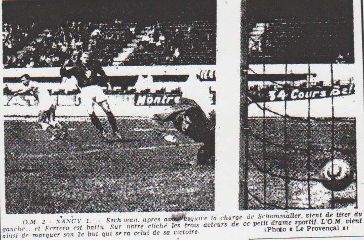 Mais il y a mieux, à la 12e minute, bénéficiant, à la fois, d'une tête de Tillon, et d'une colossale erreur de placement des défenseurs visiteurs, Eschman se voir seul, balle au pied, à 10 mètres à peine de Ferrero... et c'est le premier but pour l'O.M.