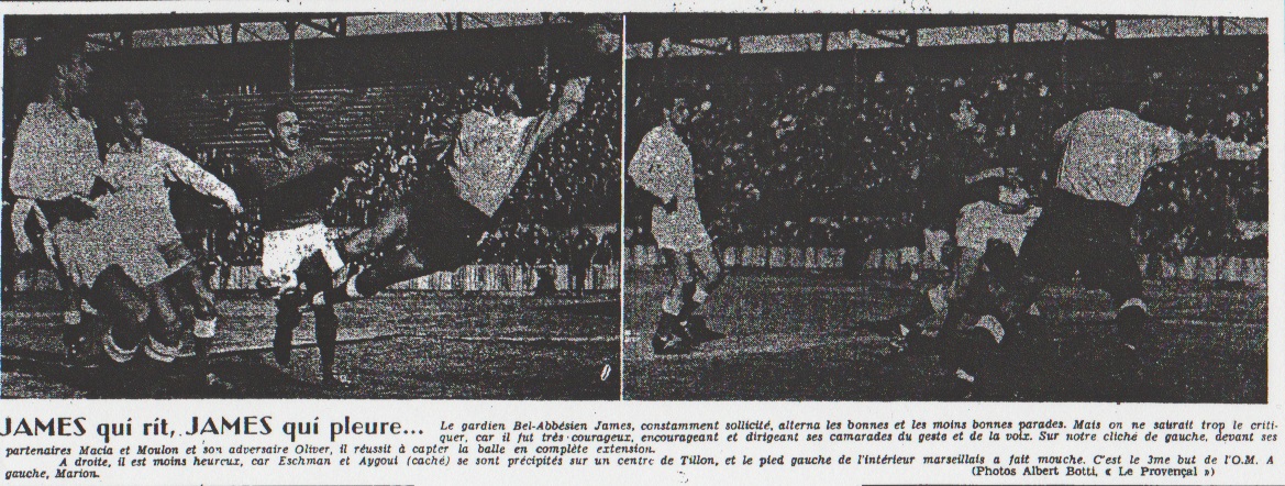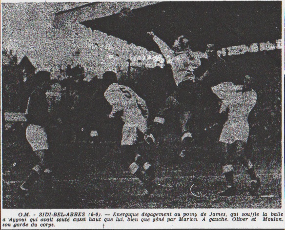 On attendait une farouche empoignade entre les pros marseillais et les purs nord-africains de Sidi-Bel-Abbes. Il n'y en eut pas, car les métropolitains, qui n'étaient guère confiants en leurs propres forces, jetèrent d'entrée toutes celles qui avaient dans la bataille. Les amateurs ne purent jamais suivre le train, et encore moins trouver la cadence accélérée qui aurait pu contrarier leurs adversaires. Dès la 12e minute Les jeux étaient pratiquement faits à la 12e minute, lorsque Marion battit son gardien James, à la suite d'une phase confuse. Car deux minutes auparavant, un centre d'Eschman avait été converti en but par Aygoui, d'une remarquable reprise de volée avec le revers du pied gauche. Deux à zéro. Il aurait fallu le miracle qui ne se produisit pas. Deux seules actions à mettre à l'actif des visiteurs : une tête imprécise de Bengamra sur centre de Taillepierre, que Molla, devançant Corazza, détournait de la tête. Mi-temps : 3 à 0 On s'acheminait vers la pause et des tirs appuyés d'Eschman et de Peri n'avaient pas modifié le score, lorsque Tillon réussit à conserver la balle sur l'aile droite, malgré l'assaut de Macia, et son centre en retrait, à mi-hauteur, fut catapulté de volée dans la cage de James par le pied gauche d'Aygoui. On alla aux vestiaires sur ce score. Les équipes étaient depuis trois minutes sur le terrain qu'Oliver, arrêté, centrait très haut, James ne bougeait pas et se faisait battre de la tête par Pierre Tillon, qui obtenait le 4e but.