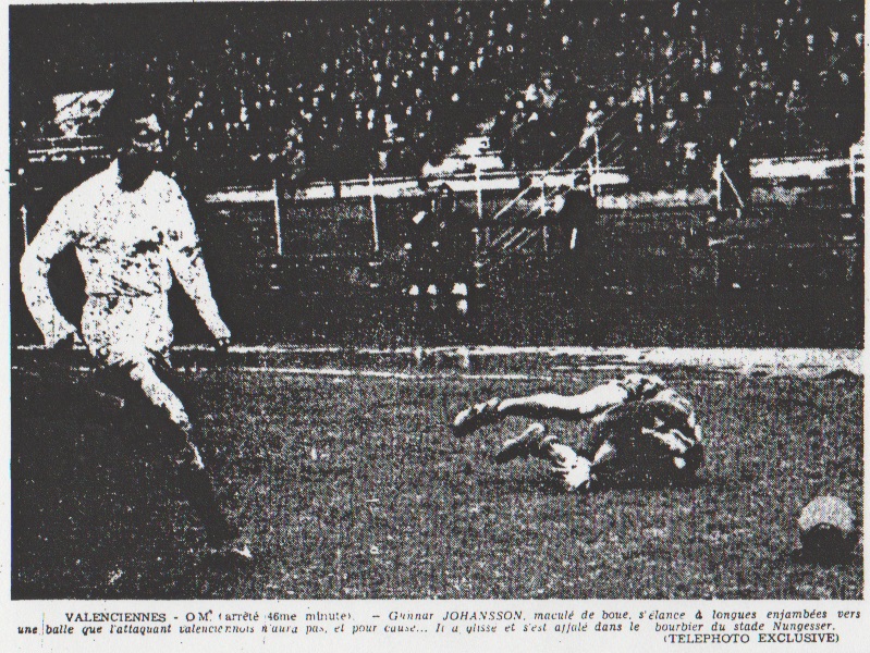 VALENCIENNES - Jusqu'au moment du coup d'envoi, on se demandait, si le match va se jouer, tant la pelouse du stade Nungesser regorge d'eau. C'est véritablement dans un marécage que M. Schwinge arrive sur le terrain pour permettre à Marcel de donner à son tour le difficile coup d'envoi. Comme il fallait s'y attendre, les locaux partent à fond. Le premier homme à terre et Jensen. Après quelques velléités marseillaises, les attaquants valenciennois s'ébranlent. Dès la deuxième minute, Stako met deux fois coup sur coup Predal à contribution, puis (4me minute) Balaguer à l'aile gauche, sollicite encore à ras de terre, le gardien marseillais qui s'en tire très bien. Deuxième corner pour l'O.M. Jensen est à son aise en ce début de match. Le flemme de Scotti, l'allant de Leonetti permettant à l'O.M. de contenir sans dommage les offensives des hommes au maillot rouge et peu à peu Jean-Jacques Marcel et ses coéquipiers rétablissent l'équilibre territorial. L'O.M. obtient deux corners au bout de 10 minutes. Tous deux sont tirés sans résultat. Sur le premier, Dantheny effectue un magnifique blocage aérien terminé par un saut périlleux, mais l'ailier insulaire met le second dehors. L'O.M. domine légèrement. Un confrère local nous souffle : "Beaucoup d'équipes mieux classées ont plus mal joué..." Reste à savoir si ça durera ! Une échappée de Fouillen oblige Predal à lui plonger au devant. |