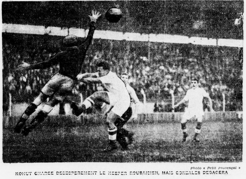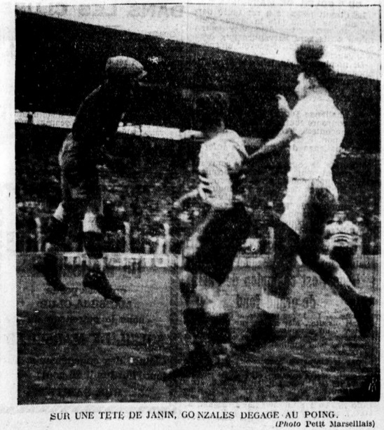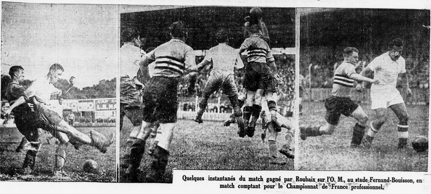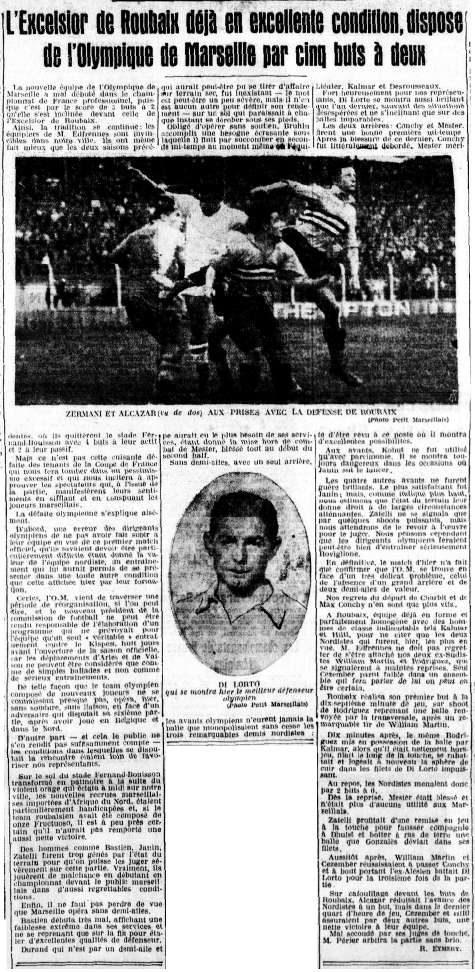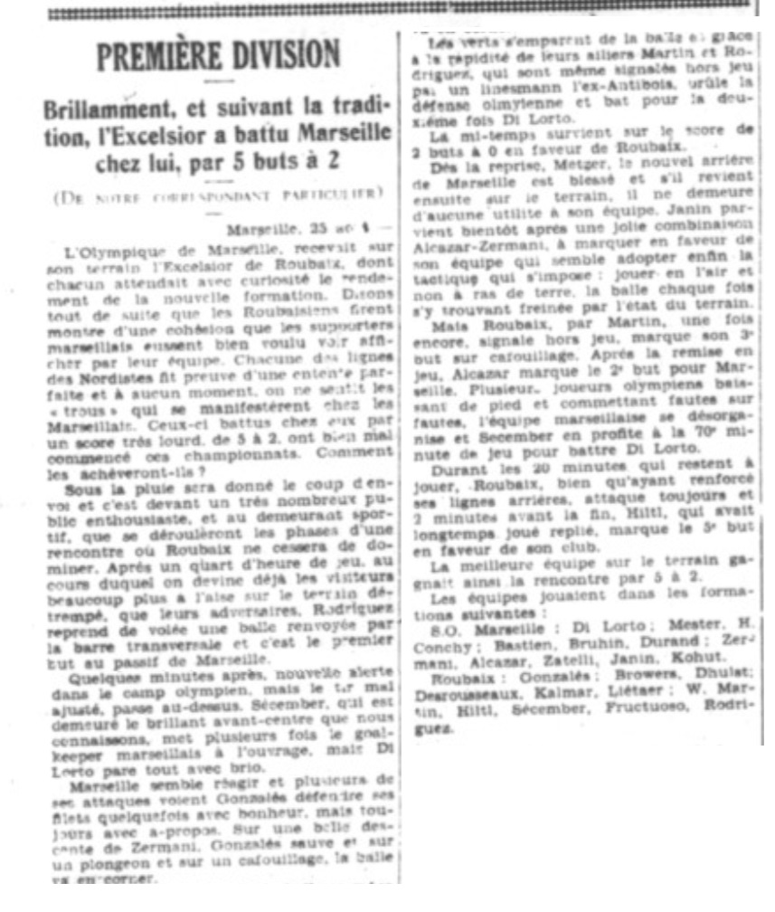 EXCELSIOR : 5 MARSEILLE : 2 ____________________ La journée d'ouverture du Championnat professionnelle au stade Fernand Bouisson n'a pas été gratifiée d'un joli temps. En effet, la pluie ne cessa de tomber qu'à 16 heures, au moment même où la partie devait commencer. Elle débuta sur un terrain entièrement détrempé et devant un nombre respectable de spectateurs. En raison du mauvais état de la pelouse, les joueurs ne purent pas toujours se mouvoir à leur aise. La partie s'en ressenti quelque peu. Il convient de dire cependant que les visiteurs furent beaucoup moins handicapés que leurs adversaires, aussi en profitèrent ils pour aborder la lutte à une bonne allure. Dès le début on eut l'impression que la rencontre serait difficile pour les Marseillais. Le jeu plus soudé, la précision des passes, le net contrôle de la balle et l'ardeur déployée par les Nordistes accentuèrent tout au long du match ce sentiment. Par contre, les Olympiens ne firent montre d'aucune coordination dans leur effort, leur jeu fut une très grande pauvreté. Il était pénible par un instant de les voir opérer sans âme, sans commandement. C'est ainsi que les Roubaisiens arrivèrent au repos avec deux buts d'avance marqués par Rodriguez, dont un sur hors-jeu que l'arbitre ne voulut point reconnaître. Les olympiens, au cours du second half, véritablement pas en course, furent encore handicapé par une blessure survenue à Metzer alors qu'il opérait au poste d'arrière. on eut pensé, c'est d'ailleurs une coutume basée sur l'expérience, que cet arrière d'aucune utilité pour son équipe, allait être placé en poste d'ailier pour laisser sa place à un camarade valide, plus à même de garantir les buts de Di Lorto. Il n'en fut rien, faute grave qui facilita à souhait les Roubaisiens et leur permit de terminer la rencontre par le score assez net de 5 à 2. Sur la rencontre d'hier, le team olympiens déçut grandement ses partisans. Jamais il ne donna l'impression de pourvoir s'imposer. Trop nombreux étaient les trous de cette formation et l'insuffisance de certains joueurs se fit nettement jour. Des nouvelles recrues, seul Janin peut parvenir à donner quelques satisfactions. L'on doit certainement regretter quelque peu les départs de Charbit, Max Conchy et Kurka, avec lesquels le rendement du onze eut donné - on en a eu d'ailleurs maintes fois la preuve - un bien meilleur résultat. Pourquoi aussi avoir écarté systématiquement le modeste Roviglione ? Son remplaçant lui est-il tellement supérieur ? Il ne nous en a point donné la preuve hier. L'action constante de tous les instants et le shoot appréciable de Rovi auraient certainement donné à l'attaque une toute autre impulsion. |