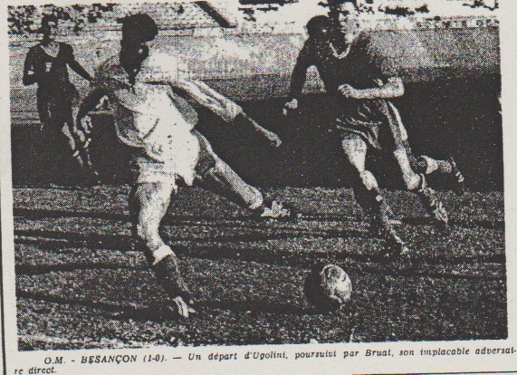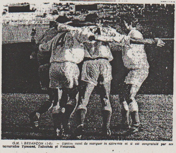 Après la pause, c'est encore Pavon qui secouait la défense adverse. Deux dribbles déconcertants se terminaient par deux bonds arrêts par Ielsch (50e), la seconde passant au ras d'un montant (51e). Le public reprenait goût au football. Enfin Gardien ! Jusqu'alors, Corazza, n'avait fait que ramasser le ballon que lui envoyaient ses arrières. A la 82e minute, gardien recevait une balle et se rappelait à notre bon souvenir en la brossant remarquablement du pied gauche. Corazza devait dévier en corner. L'O.M. se manifestait par deux bons coups francs de Aygoui, puis de Pavon, et l'on s'acheminait doucement vers le match nul, les Bisontins ne passaient pratiquement plus le milieu du terrain. Bruat blessait Ugolini et, peu après, dans une grappe humaine, un coude ou un genou olympien anonyme jouait les justiciers, Bruat allait ai tapis, les esprits d'échauffaient et le temps passait. Ugolini "in extremis" Enfin, à la 83e minute, le jeune Saudie voulait protéger le ballon qui allait vers son gardien. Il tergiversait et l'opportuniste Ugolini surgissait et marquait à bout portant le seul but du match. Deux minutes plus tard, M. Tirant, sans doute peu amusé par ce spectacle, arrêtait la rencontre, cinq minutes avant la fin du temps réglementaire. Louis DUPIC |