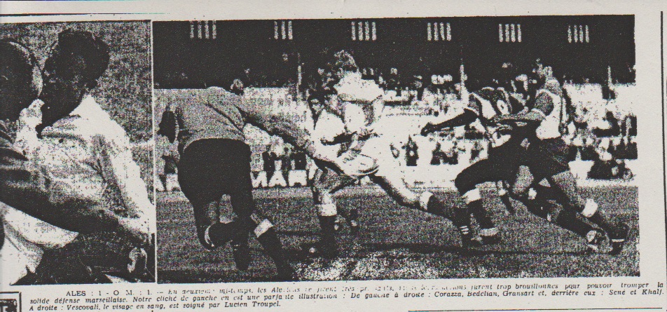 Vescovali et Delset sérieusement blessés A la 41me minute, pour enrayer une attaque menée sur la gauche par l'O.M., Delset se précipite et s'élance en même temps que Vescovali pour lui disputer la balle de la tête. Un choc violent se produit. Les deux joueurs restent à terre et, à en juger par l'affolement qui se produit sur le terrain, on craint de graves blessures. En effet, les deux joueurs rentrent peu après aux vestiaires, la tête saignant fortement. Tous deux devaient être transportés par une ambulance au Centre médical d'Alès où après les premiers soins que nécessitait leur état, ils restaient en observation. Collardos égalise Dès la remise en jeu, les Alésiens attaquent avec décision Une attaque se développe sur la droit et Khalfi, dernier servi, lance à Collados dont le tir puissant et précis trompe Corrazza. Jeu heurté en seconde mi-temps A la reprise, Bosquier prend la place de Delset. Opérant avec beaucoup d'autorité et de facilité, le jeune espoir cévenol ne cessera de se mettre en évidence à ce nouveau poste. La partie reprend à l'avantage d'Alès qui obtient coup sur coup deux coups francs. La défense marseillaise est quelque peu affoler. Pourtant, Pavon échappe à la surveillance de Bouchet et donne l'occasion à Ugolini de placer un shoot que Banide pare avec difficulté (53me minute). La qualité du jeu baisse de plusieurs fyons et l'on assiste à un football assez décousu et sans grande envergure. Heureusement l'ardeur des joueurs n'a pas faibli et le match conserve in certain attrait. A la 60me minute, un cafouillage monstre se produit devant la cage de Corrazza et finalement Collados tire en plein sur la barre. La réplique ne se fait pas attendre et voila Pavon qui part seul droit aux bits. Mais en grandes foulées, Sene le remonte et, comme l'avait fait Molla en première mi-temps, évite le but en mettant la balle en corner. Dans les dernières minutes, l'O.M. se donne enfin de l'air et Banide est à l'ouvrage. Une belle envolée de sa par lui met d'atteindre la balle, envoyée en pleine lucarne par Ugolini. Et finalement c'est sur un match nul équitable que se termine la partie. Maurice LAURENT |