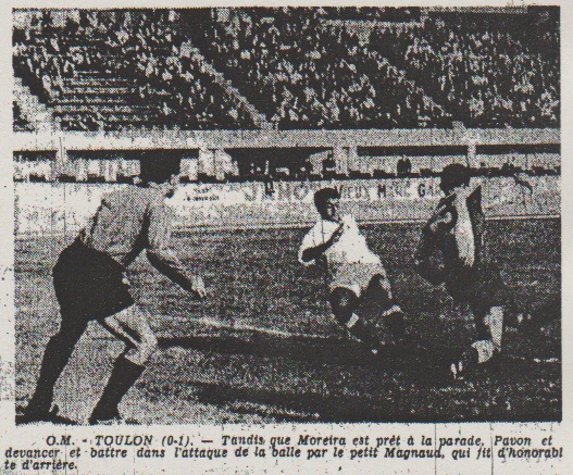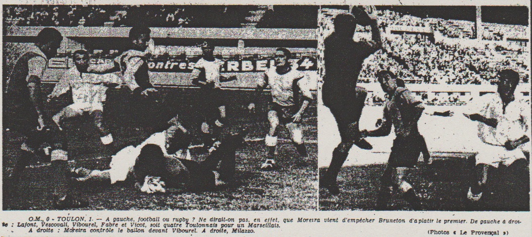 Quand on ne compte que sur l'imperméabilité d'une défense pour marquer des points, à défauts de but, on se trouve à la merci d'un accident. C'est un accident de cette sorte qu'a connu l'O.M. hier après-midi. En quatre fois 90 minutes (à Montpellier, contre Besançon, à Alès et à Aix), l'attaque marseillaise n'avait marqué que 2 buts elle-même et un troisième par la personne interposée de Camoin. La défense ayant sauvé la face (2 buts encaissés pendant ces quatre rencontres) le bilan général avait pu paraître favorable. Mais il était bien évident que l'avantage pris ne pourrait être maintenu longtemps par une équipe dont l'attaque se montrait aussi résolument inoffensive. Le verrou de Toulon... Contre Toulon, le fiasco de la ligne d'avants de l'O.M. a été si total, si désolant qu'un seul but concédé par Corazza a suffi à jeter bas l'échafaudage laborieusement dressé au fil des derniers dimanches. C'est surtout en premier mi-temps que l'O.M. a perdu son match. Il sautait aux yeux, dès les premières minutes, que Toulon, venu sans grande conviction au Stade Vélodrome, comptait essentiellement sur une défense renforcée pour limiter les dégâts. Vibourel (le n.5 varis ) était chaperonné, protégé par papa Rossi et grand-papa Lafont qui mettaient leur poids et leur expérience au service de leurs partenaires de la défense. D'où une sorte de verrou au centre que seul un aveugle pouvait ne pas voir. ... et la clé de l'O.M. Or, l'attaque marseillaise se mit à jouer la clé, si nous osons dire. Elle s'applique, s'acharne, surtout par Pavon, dont la façon de jouer fut incompréhensible, à venir fermer ce verrou. Au sujet de Pavon, nous ne comprenons plus. Voila u garçon qui jouait fort bien quand il sortait des rangs de l'amateurisme et qui semble avoir appris à déjouer depuis qu'il est professionnel. La même remarque peut s'appliquer à Yansanne et à Vescovali qui, dimanche après dimanche, perdent leur peu de savoir. |