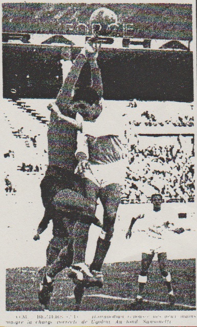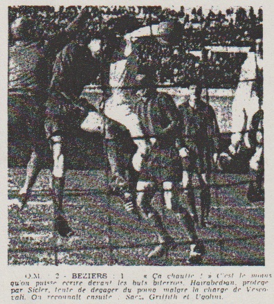 En battant Annecy, les amateurs locaux venaient d'ouvrir la voie aux succès olympiens. C'était un heureux présage. Néanmoins les Biterrois avaient les premières occasions. Dès la première minute, Nury ouvrait vers Boukhalfa qui, "encore froid" ne tirait pas parti de la situation. Coup sur coup, au 7e et 10e minute, Corazza, sur tir de loin de Nury, Hairabedian, sur tir à bout portant de Lefevre, devaient faire preuve de leur talent. Hairabedian intervenait encore en plongeant sur un tir de Sansonetti lancé par Ugolini. Lefevre ouvre la marque A la 17e minute une erreur de Gritfith permettait à Bedelian de contre-attaquer avec décision. Il poussait loin son action et Lefevre dernier possesseur de la balle, tiré à ras de terre et en biais, la balle ricochée sur un montant. Ceci du pied gauche cela va de soi. L'O.M. continuait à dominer nettement, mais sans accentuer son avantage. En 26e minute Hairabedian, impeccable, plongeait sur la reprise par Aygoui d'un centre de Sansonetti. Il repoussait la balle que personne ne parvenait à reprendre. Vescovali échoue Peu avant la pause, Vescovali qui fut d'ailleurs bien plus en verve à l'aile droite qu'à l'aile gauche précédemment, eut la malchance de voir se présenter sur son pied gauche une balle centrée par Lefevre. L'O.M. rata ainsi une belle occasion de prendre le large. Après la reprise, l'O.M. continua à dominer, mais c'est Béziers qui égalisa dans les circonstances suivantes à la 52e minute. Un exploit de Boukhalfa Sur une contre-attaque visiteuse, le jeune intérieur Cuxac réussit à conserver la balle et à lancer son ailier Boukhalfa, délaissé par Gransart sur l'aile gauche. Boukhalfa entra dans la surface de réparation marseillaise et, avant d'être attaqué par Molla, déclenchant un tir croisé remarquable distance de 15 mètres qui laissa Corazza impuissant. |