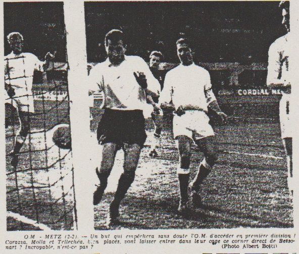 L'O.M. continuera à conserver le contrôle des opérations, malgré quelques pâles réactions des visiteurs... Le drame A la 74e minute, Aygoui était sérieusement blessé à la base du tibia par le noir Kouadio. On l'emmena sur la touche, tandis que la défense locale perdait de son assurance. A la suite d'un coup franc, un centre de Wagner été malencontreusement repoussé par Corazza, assez loin, mais sur le pied de l'arrière Grimbert placé en embuscade à 25 mètres. Celui-ci réussissait un tir splendide de puissance et de précision, et l'O.M. commençait à douter de sa chance. Nous étions à la 74me minute et l'on soignait Aygoui. Deux minutes plus tard à la 76me minute, Bruneton concédait un corner. Bessonnart le donnait, mais ratait sa frappe. La balle tombait vers le montant le plus proche, au milieu des joueurs marseillais. Chacun voulant laisser la balle à l'autre, celle-ci allait finalement dans les filets, à la stupéfaction générale. C'était le but le plus stupide qui soit. Les dernières minutes ne changèrent rien au résultat. Les Messins étonnèrent plus que jamais. Les efforts des olympiens furent impuissants à leur redonner une victoire qu'ils laissaient échapper aussi bien par la chance que par maladresse. C'est encore le blessé Aygoui, revenu sur le terrain, qui réussira à inquiéter Altpeter d'un splendide tir de sa jambe malade. Mais le gardien messin s'envolera littéralement et préservera le nul inespéré obtenu par les Lorrains. Louis DUPIC |