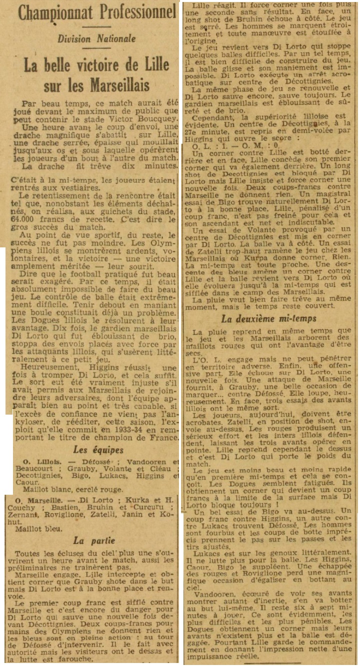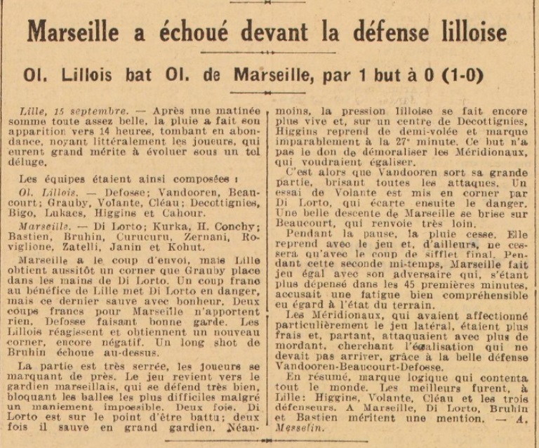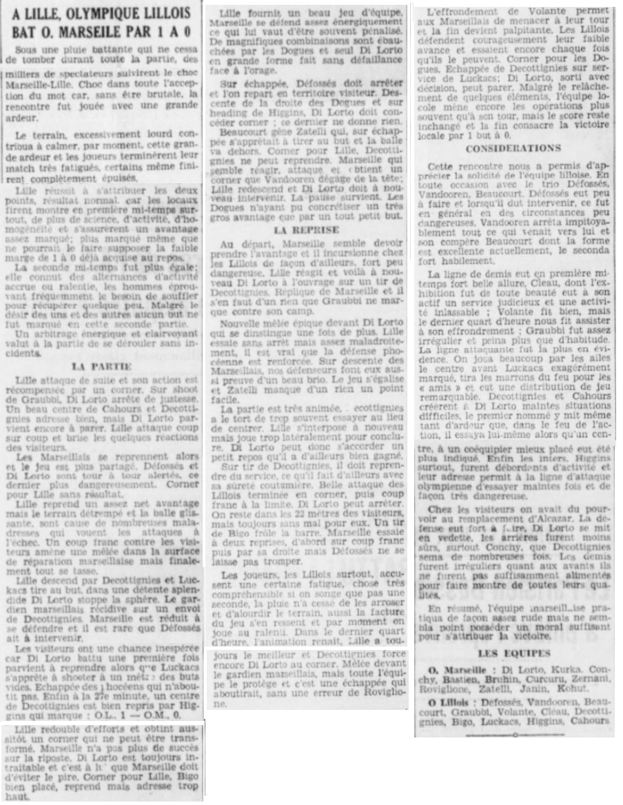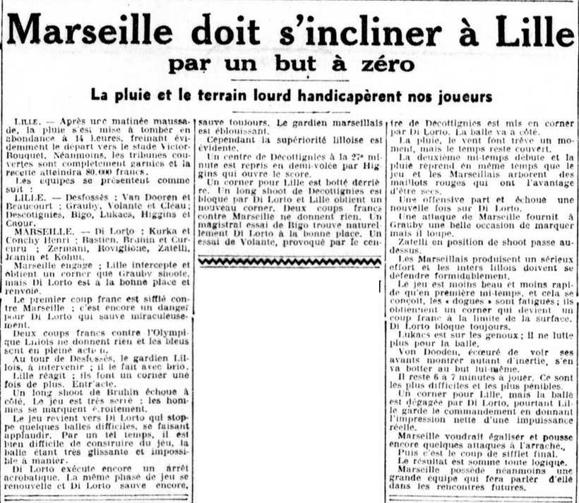 LILLE : 1 MARSEILLE : 0 ____________________ Lille, 15 septembre Les Méridionaux ont été battus... Pas tant par les nordistes que par leur climat humide, leur terrain boueux et par un ballon glissant et lourd. Après une matinée grise sur le coup de deux heures, lorsque la pluie s'est abattue sur la ville. Malgré le temps, les trois tribunes du stade se remplissent et même quelques gradins. On peut estimer, en effet que 9.000 le nombre de spectateurs et ce n'est déjà pas si mal ! Quelques changement ont été apportés dans la composition de l'équipe de Marseille : Alcazar blessé est remplacé par Roglione, tandis que le Nord Africain Zatelli prend la place d'avant centre. A Lille, Delannoy a été remplacé par Decottignes. Sous une pluie battante, les deux équipes se font applaudir dès leur apparition sur le terrain. Les Lillois sont dangereux dès le début, et il y a à peine une minute de jeu que la défense marseillaise doit concéder un premier corner. Celui-ci est trsè dangereux et Di Lorto sauve heureusement ses buts. Mais l'Olympique de Marseille se met en action et effectue une belle attaque par l'aile gauche. Celle ci se termine sans résultat. Les Marseillais qui paraissent figés au début, ce en quoi il ne faut pas être étonné, étant donné les conditions atmosphériques défavorables se reprennent brillamment et la partie est très animée. A la dixième minute ce cette première mi-temps, un second corner à l'avantage des Lillois est concédé par Conchy. Mais de nouveau les Lillois n'en tirent pas profit. La partie continue quelque peu durement par instants. A la 25è minute sur une rapide échappée de Decotigues, le goal marseillais, Di Lorto sauve brillamment ses buts par une parade audacieuse. Et à la 27è minutes, Di Lorto doit s'incliner sur un shot de volée de Higings reprenant un centre de Decottignies. Le jeu continue très animé. Les Marseillais ont tout à faire. Les dernières minutes de jeu sont favorable aux Marseillais qui ne parviennent pas à égaliser. La mi-temps se déroule sur un terrain ressemblant à un marais et nos compatriotes glissent à qui mieux mieux. Pourtant pendant une vingtaine de minutes, ils seront très menaçant, c'est à dire qu'il mèneront le jeu au centre du terrain... et emmèneront le ballon près de la ligne lilloise. |