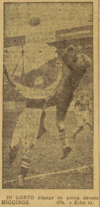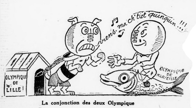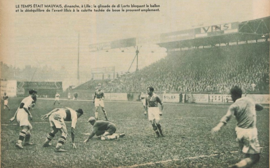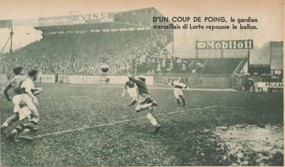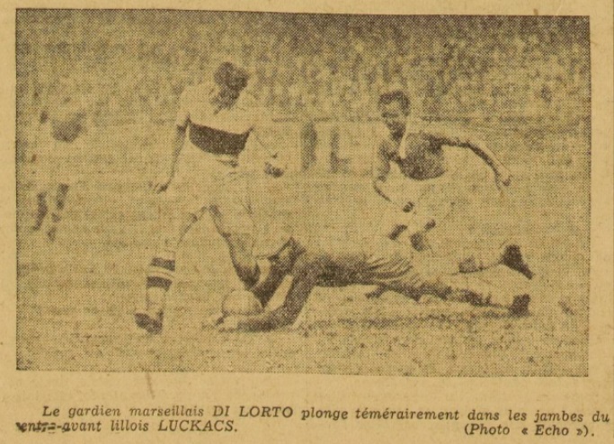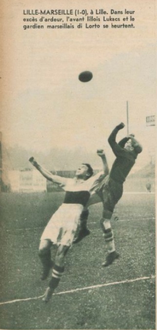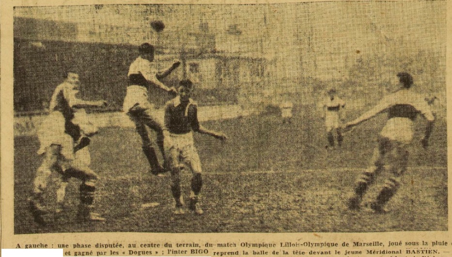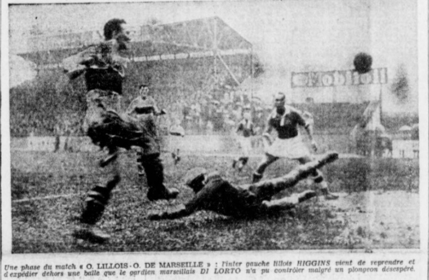 LILLE : 1 MARSEILLE : 0 ____________________ Lille, 15 septembre Les Méridionaux ont été battus... Pas tant par les nordistes que par leur climat humide, leur terrain boueux et par un ballon glissant et lourd. Après une matinée grise sur le coup de deux heures, lorsque la pluie s'est abattue sur la ville. Malgré le temps, les trois tribunes du stade se remplissent et même quelques gradins. On peut estimer, en effet que 9.000 le nombre de spectateurs et ce n'est déjà pas si mal ! Quelques changement ont été apportés dans la composition de l'équipe de Marseille : Alcazar blessé est remplacé par Roglione, tandis que le Nord Africain Zatelli prend la place d'avant centre. A Lille, Delannoy a été remplacé par Decottignes. Sous une pluie battante, les deux équipes se font applaudir dès leur apparition sur le terrain. Les Lillois sont dangereux dès le début, et il y a à peine une minute de jeu que la défense marseillaise doit concéder un premier corner. Celui-ci est trsè dangereux et Di Lorto sauve heureusement ses buts. Mais l'Olympique de Marseille se met en action et effectue une belle attaque par l'aile gauche. Celle ci se termine sans résultat. Les Marseillais qui paraissent figés au début, ce en quoi il ne faut pas être étonné, étant donné les conditions atmosphériques défavorables se reprennent brillamment et la partie est très animée. A la dixième minute ce cette première mi-temps, un second corner à l'avantage des Lillois est concédé par Conchy. Mais de nouveau les Lillois n'en tirent pas profit. La partie continue quelque peu durement par instants. A la 25è minute sur une rapide échappée de Decotigues, le goal marseillais, Di Lorto sauve brillamment ses buts par une parade audacieuse. Et à la 27è minutes, Di Lorto doit s'incliner sur un shot de volée de Higings reprenant un centre de Decottignies. Le jeu continue très animé. Les Marseillais ont tout à faire. Les dernières minutes de jeu sont favorable aux Marseillais qui ne parviennent pas à égaliser. La mi-temps se déroule sur un terrain ressemblant à un marais et nos compatriotes glissent à qui mieux mieux. Pourtant pendant une vingtaine de minutes, ils seront très menaçant, c'est à dire qu'il mèneront le jeu au centre du terrain... et emmèneront le ballon près de la ligne lilloise. |