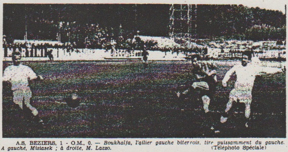 BEZIERS - "En avril n'ôte pas un fil... Même le 30 de ce mois capricieux !" Pour avoir cru que nos anciens radotaient nous avons dû, dimanche, à Sauclières, mettre un lourd manteau d'hiver sur un costume d'été. Sinon, le vent du Nord, aidant, nous eussions immanquablement hérité de la dernière grippe biterroise de la saison. L'O.M. n'aime pas le vent Les joueurs qui, heureusement pour eux, se remuent, n'avaient en définitive, qu'à tenir compte de l'influence de cet élément déchaîné sur la conduite du ballon. L'O.M. débutant avec le vent dans le dos, sembla se refuser à considérer cet allié naturel comme un auxiliaire. Aussi, malgré un violent tir de Sansonetti (3me minute) qui tordit presque les mains d'Hairabédian, vit-on les joueurs marseillais, adopter, sur le terrain, une position extrêmement prudente. On pense surtout aux deux demi-ailes : Tellechea et Milazzo qui restèrent obstinément au niveau de leurs arrières. Tant et si bien que le score était toujours de 0 à 0 à la mi-temps. Béziers, dans les joueurs faisaient preuve d'une folle activité, avait même plutôt dominé. On avait noté un but marqué par Boukalfa (15me), mais refusé par l'arbitre pour hors-jeu ; et deux tirs de Robinet, le noir avant-centre, qui permirent à Corazza de se distinguer. Quant à l'O.M., seul un second et dangereux essai de Sansonetti avait traduit dans les faits ses rares velléités offensives. Sansonetti se distinguent... On s'aperçut, des la reprises, que les Marseillais jouaient beaucoup mieux contre le vent. |