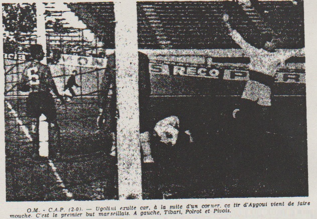 Comme cela arrive souvent, l'O.M. ne profite pas, en première mi-temps, de l'avantage d'un vent assez violent. Une demi-heure de domination, constante ne se traduisit que par quelques tirs. Qu'on n'en juge : A la 8me minute, Lefevre place un bon tir au-dessus de la transversale. Deux minutes plus tard, Sansonetti s'échappe et croise un tir à ras de terre bien arrêtée par Pivois. À la 20me minute, Pivois renvoie du poing dans l'axe du terrain un centre de Lefevre, Ugolini reprend et met nettement au-dessus. A la 25me minute, c'est le premier tir sérieux, assez tendu de Kominek que Pivois arrête en deux temps. Trois minutes plus tard, le public siffle Sansonetti qui vient de manquer la reprise, difficile, d'une passe de Aygoui à hauteur. Puis à la 34me minute, on note la première véritable offensif du C.A.P. par M'Barek, le plus doué mais le plus fainéant des avants visiteurs, et Halberda. Avec un peu de réalisme, les Parisiens devaient ouvrir le score sur cette action. Les deux équipes quittent la pelouse au milieu de "mouvements divers" des 1.217 personnes de la famille présente au Stade. Aygoui rassure ses camarades Dès le début de la seconde mi-temps, Lefevre contraignit Pivois à un bel arrêt. Puis les visiteurs, à la 50me minute, développaient la plus belle action offensive du match. Halberda attaqué sur l'aile droite, donner à M'Bark qui redressait vers Bamana. Ce dernier, face à Corazza, tirait trop mollement et la balle était interceptée par le gardien local. Tout de suite après, l'O.M. obtenait un corner tiré par Kominek, et Aygoui, placé en embuscade à la limite de la surface de réparation, plaçait en demi-volée et du pied droit un tir remarquable. |