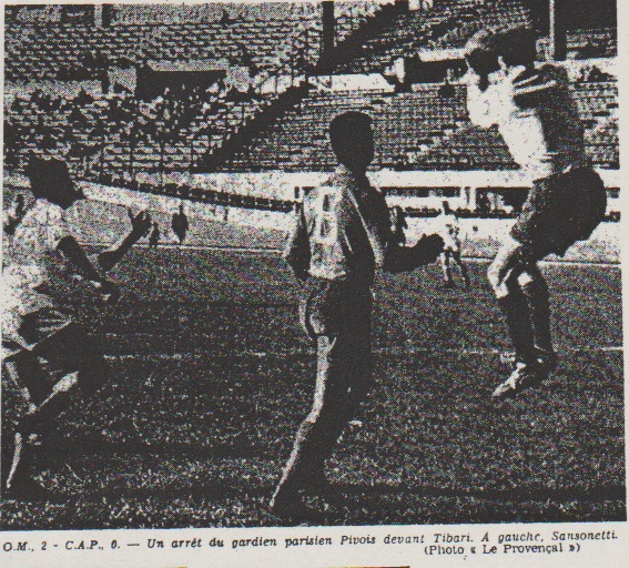 1 à 0 pour l'O.M. A la 12me minute, après un nouveau corner obtenu par un tir d'Ugolini, Pivois avait un excellent réflexe sur la reprise de Sansonetti. Il fallait attendre douze minutes assez mal utilisées par les deux équipes pour assister à une nouvelle parade de Pivois sur tir de près à ras de terre d'Ugolini qui, une minute plus tard, l'inquiétait encore d'une tête précise mais trop peu appuyée. Sansonetti échoue Kominek réussi A la 28me minute, C.A.P. occupait le camp local, Kominek alertait Sansonnetti qui partait à toute allure de la ligne médiane, mais venait échouer sur Pivois à la limite de la surface de réparation. Le temps de commenter l'événement et Fritz Kominek, parti de moins loin, mais au milieu de nombreux adversaires, perçait avec précision et décision et réussissait à devancer le plongeon de l'excellent Pivois et à obtenir le second but. Ensuite, bien entendu, les jeux étaient faits. Le C.A.P. joua son va-tout, mais cela ne pouvait le mener bien loin. Au cours de ce dernier quart d'heure, qui parut très long aux spectateurs frigorifiés, Halberda et Sansonetti réussir tour à tour à parvenir en bonne position sans en tirer parti. Personne ne regretta le coup de sifflet final. L.D. |