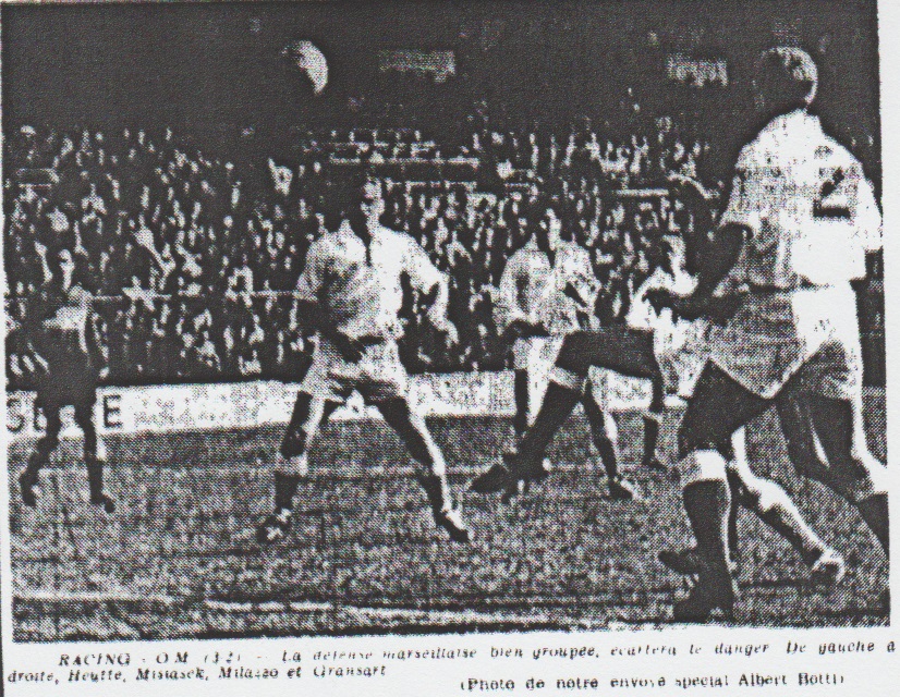 Et ce fait vraiment dommage de voir un aussi beau jeu que celui fait par les joueurs marseillais sur ce terrain de Nice, tombeau de leurs espérances en Coupe, pour la troisième fois consécutive, être si mal payé. A la fin de cette passionnante rencontre qui tint constamment en haleine ses 15.000 spectateurs, on se demanda quels avaient été les meilleurs joueurs marseillais. Commençons par affirmer qu'un aussi beau résultat collectif ne peut s'obtenir sans que chacun ait mis plus ou moins le pied à la pâte. Pour notre part nous ne voyons aucun joueur marseillais qui ait démérité . Même pas Pavon qui certes, fut le moins bon de tous mais qui avait en Marche un adversaire particulièrement expérimenté et décidé. Que le petit Pavon n'ai pas pu dominer le grand marche n'est tout de même pas une raison pour condamner ce débutant. Kominek grand bonhomme de la rencontre Ce cas particulier traité, il reste que le grand bonhomme de l'O.M. et de la rencontre fut Fritz Kominek. Le stratège viennois s'est surpassé. Il a donné non seulement la leçon de football à certains de ses réputés adversaires, mais encore il se battit de bout en bout avec un coeur de vieux lion. Pour fixer les idées de ceux qui n'ont pas assisté à la rencontre, disons que nous l'avons vu, à quelques minutes d'intervalle, reprendre un centre de Lefevre de la tête et dégager son camp de la tête à quelques mètres de Corazza. Après lui, dans l'ordre de mérite la citation revient à Milazzo. Ce qu'a pu faire l'inter olympien, tant en défense qu'en attaque, c'est inimaginable. Ugolini, seul contre tous Nous nous excusons de parler de Kominek et de Milazzo avant d'en venir à Raphael Tellechea, à Misiasek et à Lefevre tous quatre excellents, mais ce qu'ils entreprirent et réussirent étant ce que l'on peut demander de plus difficile à un footballeur. Molla dans un rôle de défenseur de soutien, fut irréprochable, aussi que Corazza. Gransart fit également un bon match, entachés cependant de quelques imprudences offensives. Quand à Ugolini, après une remarquable première mi-temps, il accusa nettement la fatique. Mais il est utile d'ajouter que lui, qui n'est , somme toute que l'avant centre de l'équipe de France juniors, se trouva seul au milieu de trois ou quatre des défenseurs les plus réputés de France. Bodin, meilleur Parisien Au Racing le numéro un revient sans discutions possible à Bodin, le calme personnifié. Avec lui on peut accorder une mention aux défenseurs et aux demis en général, à Marche en particulier. Mais l'attaque sans son habituel Ujlaki, déçu passablement. Si l'on excepte quelques éclats de Marcel, de Quedec ou de Van Sam, elle joua en ordre très dispersé; En outre, certains de ses titulaires, on pense surtout à Heutte, furent d'une timidité coupable dans l'attaque du ballons. Hélas, tout ceci n'enlève rien au fait que pour le Racing, la fête continue et que l'O.M. pour sa part, gardera un arrière goût d'amertume de cette rencontre. |