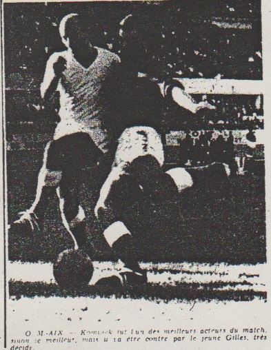 Curieuse rencontre en vérité, qui comporte une première mi-temps languissante au possible et une seconde partie forte animée... au cours de laquelle on entrevit une lourde défaite aixoise, alors que les visiteurs passèrent finalement très proche du nul. Mais ce sont la les paradoxes courants du football. Un exploit de Kominek Après 20 minutes de jeu assez terne, et en tout cas fort lent, marqué seulement par une percée de Sene bien enrayé par Escale (8e) qui se coucha dans ses pieds, Kominek s'élança entre les défenseurs aixois pour recueillir un centre aérien de Lefevre, le contrôle acrobatique et, tout aussi habilement, loba Carnus sorti à sa rencontre. Bien sûr, la balle rebondit sur la transversale, mais le mouvement était remarquable et la réalisation parfaite... ou presque. L'exploit fut salué comme il convenait, mais le public resta ensuite longtemps sur sa faim. L'O.M. dominé nettement. Aux 30me et 32me minute, Yansane servi tout d'abord par Kominek puis par le renvoi par Carnus d'un tir de Sansonetti, s'échouait coup sur coup d'assez peu. Peu avant la pause, Pavon démarqué près du but aixois, ratait complètement la conclusion d'une action Lefevre-Sansonetti. Un tir de Yansane On avait repris le jeu depuis 8 minutes lorsque Leonetti stoppa nettement une attaque de Sene et servit longuement Lefevre, le long de la touche. Le public salua tout d'abord d'un murmure l'amorti de l'ailier, qui servit immédiatement Yansane. Celui-ci ne tergiversa point, fit quelques pas et tira sèchement de plus de 20 mètres. La balle tendue frappa violemment sous la transversale avant de pénétrer dans les filets... L'O.M. libéré de ses craintes déferla sans cesse vers la cage aixoise supérieure défendue par Rustico, Camoin et Carnus. Ce dernier intervient sur des tirs de la tête ou du pied de Pavon, très en verve, au 58e et 60e minute et sur un bon tir de Sansonetti à la 65me. |
