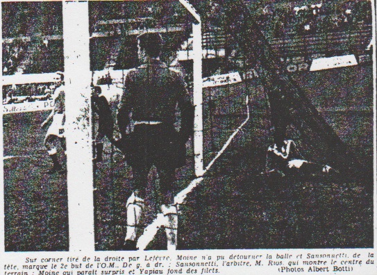 Le public marseillais pouvait attendre de l'O.M. une rencontre de rachat, après la diffusion de Cannes, venant après les espoirs qu'avait fait naître une victoire indiscutable sur Valenciennes. Certes, l'O.M. la remporté sur Cherbourg, mais dans toute victoire, comme dans toute défaite, il y a la "manière" qui compte. Le moins qu'on puisse dire, c'est qu'actuellement, l'O.M. n'a pas la manière. Il a gagné contre Cherbourg comme il avait perdu à Cannes, médiocrement. Pourtant Cherbourg, dix-huitième du classement, n'est pas une grande formation. C'est une équipe courageuse et, partant de là, sympathique. On ne peut pas dire qu'elle bétonna. Elle fut pressée sur son but par un adversaire mieux armé, mais contre attaqua chaque fois qu'elle en a eu l'occasion, surtout par son minuscule intérieure de pointe : Badia, qui est rapide, bon manieur de balle et extrêmement courageux. Il livra à Knayer hier un rude duel, ne se laissant jamais rebuter par le marquage sévère auquel l'arrière central marseillais le soumis. Une fois, Badia réussit à percer sur la droite et à arriver en bonne position. De quelques mètres et en biais, il enleva sa balle et prouva que le tir n'était pas son point fort. Un but de curieux A la 32me minute, Cherbourg n'avait été inquiété (jusqu'alors) que par un tir plongeant de Kominek qui battit Moine, mais s'écrasa sur la transversale. À cette minute fatale, Khima voulut dégager et son dégagement fut freiné par la main de Pavon, qui se trouva en position de la balle. M. Rios ne siffla pas, et Cheyssac revenu en défense bouscula et abattit Pavon. L'O.M. bénéficia alors d'un coup franc à la limite qui fut donnée de façon extrêmement suspecte par Lefevre et Aygoui qui plaça son gauche à ras de terre et dans le coin des filets de Moine. Klemmenzak protesta auprès de M. Rios, et il eut raison, car l'arbitre en ne sanctionnant pas la main de Pavon commit une première faute. Même involontaire, cette main profita à l'O.M. Enfin, nous avons eu, de 60 mètres, il est vrai, impression que Lefevre avait donné à Aygoui la balle de la main. |