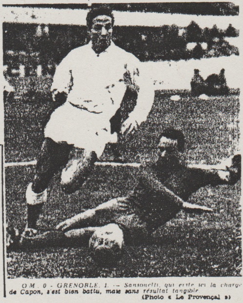 Et quelques occasions. La pression dauphinoise fut ponctuée à la 65me minute par une bonne combinaison Dereuddre - Van Rhyn - Levandovicz sur laquelle Moreira se détendait et déviait en corner. À la 70me minute, un centre aérien de Levandovicz était rabattu de la tête par Van Rhyn, mais son tir frôlait le montant. Enfin Desgranges s'échapper tirait sur Moreira. Van Rhyn reprenait le renvoi du gardien marseillais mais tirait sur la barre. On voit qu'au cours de ce quart d'heure, milieu de la seconde mi-temps, Grenoble se comporta en bon leader. Par opposition, les actions de la ligne d'attaque mutilée de l'O.M. étaient bien moins net. Sansonetti avait permuté avec Yansane, mais il s'est heurté à une défense solide. Abad stoppait un de ses tirs à la 62me minute, et Vovalski, une fois de plus, l'arrêtait de façon très suspecte, ce qui ne lui coûtait qu'un corner. Il avait frôlé le penalty. Yansane, de son côté, se trouvait encore en bonne position à la 68me minute, mais plaçait sa balle bien au-dessus, montrant que ce n'était pas son tour. Grenoble se défend Au cours des vingt dernières minutes qui durent paraître longues à Fornetti, les leaders ne laissèrent que Levandovicz en pointe avec Van Rhyn et se contentèrent de défendre leur mince avantage. Ils y parvinrent nous ne dirons pas aisément. Mais tout au moins sans se désunir, ni sans perdre leur sang-froid, et cela est fort méritoire. Les attaquants marseillais, Aygoui y compris, se montrèrent très courageux, à l'image de Sansonetti, mais l'on sait que cette qualité n'est pas suffisante pour obtenir de grands résultats... ni pour battre un leader. Les dernières minutes se déroulèrent dans une demi-obscurité. Espérons seulement que la seconde partie de cette malheureuse saison ne se déroulera pas dans une obscurité complète... qui n'arrangerait guère les affaires de l'O.M., ni celle du football à Marseille. Louis DUPIC |