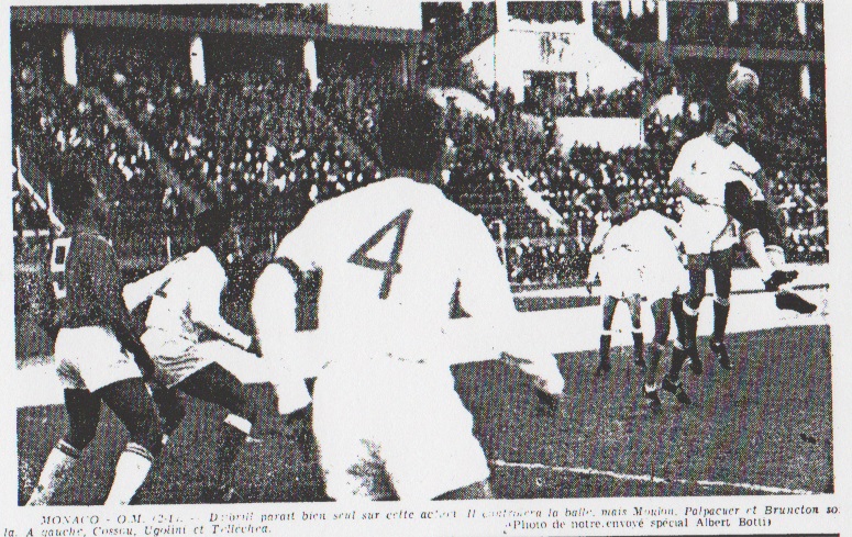 Pendant ce temps, Monaco ne restait pas inactif. Théo (25me), Cossou (30me), à nouveau Cossou (32me), Djibrill (35me), Biancheri (37me), Douis sur coup franc (38me), Carlier (40me) passaient eux aussi assez près de la réussite. L'occasion de Dogliani Peu de temps avant la pause (44me minute), Roy donnait sur la gauche à Dogliani qui évitait Forcherio, dribblait Hernandez sorti à sa rencontre, mais envoyer trop mollement d'une position difficile, il est vrai, la balle vers la cage ou l'arrière central local Artelesa la récupérée in extremis. L'O.M. venait peut-être de rater la balle de match. Deux réflexes de Moreira Seconde mi-temps après qu'Aygoui, à la suite d'une offensive de Moulon ait tiré de très peu à côté, Monaco dominait nettement et se créait à son tour les meilleures occasions. À la 48me minute, sur centre aérien de Carlier, prolongé par une tête de Cossou, Moreira s'envola littéralement pour aller cueillir en coin une balle extrêmement difficile. Deux minutes plus tard, Cossou échappait à Tellechea, sur la gauche, et centrait au cordeau. Douis surgissait en courant et plaçait un coup de tête terrible que Moreira réussissait à relever en corner au-dessus de la transversale. Il semblait alors que Monaco ait manqué ses meilleures occasions de prendre l'avantage. Dominés, les Marseillais gardèrent la tête froide et réalisaient un bon match défensif. Le but vainqueur Mis à la 72me minute, à la suite d'un renvoi de la tête de Palpacuer, Stopyra, bien placée pourtant, hésitait et laissait la balle à Théo. Ce dernier tirait violemment de 25 mètres et la balle frappée sous la transversale, rebondissait au sol à l'intérieur de la ligne. Moreira dégager immédiatement mais l'arbitre, M. Lacoste, montrait le centre du terrain. Dès lors, les réactions marseillaises ne devaient pas modifier le résultat, Monaco joua prudemment au cours du dernier quart d'heure. Ultime réaction et incident Mais cette rencontre, extrêmement fertile en rebondissements et en action dangereuse, devait se terminer par un incident. À la suite d'une dernière offensive marseillaise, Aygoui se trouvait avec la balle au bout du pied gauche, à 15 mètres du but d'Hernandez. Le tir partait très sec. La balle passait à côté et toute l'équipe marseillaise se retrouvait gesticulant retour de M. Lacoste... qui secouait la "meute" et sifflait la fin du match. C'est aux vestiaires que nous avons appris que Hidalgo aurait dévié d'une "manchette", la balle qui prenait la direction de la cage. Mais du haut de notre perchoir, dans le soir tombant, nous devons avouer que nous n'avions rien vu. |