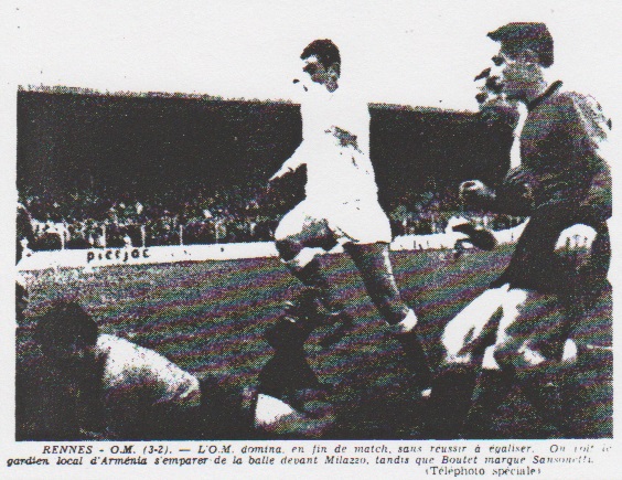 Rennes - Le gris de la Bretagne, pas plus que l'azur de Provence, ne paraît porter chance à l'O.M. Pourtant, sous ce ciel gris, la pelouse était en parfait État, la température douce l'équipe rennaise réduite à 10 joueurs dès la dixième minute. Mais quand on n'a pas de chance, ou plutôt quand on ne sait pas saisir sa chance, les meilleures occasions de gagner un ou même deux points s'envolent. Car hier, contrairement à ce qui s'était passé contre Strasbourg trois jours plus tôt, c'est l'O.M. qui domina de bout en bout, qui tira le plus souvent au but et qui cependant s'inclina. L'O.M. joue bien et encaisse deux buts. Dès le début de la rencontre, nous avions pu croire que l'équipe marseillaise allait nous surprendre agréablement. Aygoui et Milazzo occupant le centre du terrain tandis que Sansonetti, Stopyra et Viaene, de la gauche à la droite se tenaient en pointe. Elle mit à son actif les premières offensives. La défense, groupée autour de Knayer, faisait son devoir et Bruneton manifestant un assez net retour en forme, on pouvait espérer en une victoire, ou du moins en un match nul. D'autant qu'en face, les Rennais jouaient avec un dilettantisme certain. Cette impression allait s'accentuer, quand, dès la dixième minute, Goujon victime d'un coup tête involontaire de Bruneton dut quitter le terrain. Or, c'est pendant que les Bretons jouaient à dix privés précisément de leurs grande vedette internationale, que l'O.M. allaient encaisser deux buts particulièrement stupides. Le premier consécutif à une passe de Tellechea à Moreira, mal contrôlée par ce dernier. Le second du a un tir placé, mais pas très fort, de Loncle, de 23 à 25 bons mètres "comme dans du beurre !" Quand Goujon, paraissant encore choqué par le coup qu'il avait reçu à la tête entra sur le terrain, le principal été déjà fait. D'ailleurs, à peine Goujon venait-il de reprendre sa place que Pellegrini, victime d'une entorse du genou se dirigeait vers les vestiaires pour ne plus quitter. C'est donc à dix que les Rennais jouèrent presque du commencement à la fin. Espoirs et déceptions Quand commença la deuxième mi-temps, on s'aperçut immédiatement que, malgré son retard de deux buts, l'O.M. avait tout de même une chance sérieuse de l'emporter. Il y avait qu'une équipe sur le terrain : la marseillaise. Curieux mais vrai, le leader breton et sa fameuse triplette armoricaine "ne touchait pas une balle" devant les olympiens. Quand Aygoui, ayant pris par d'Armenia à contre-pied d'un tir du gauche, donné de la ligne des 18 yards, on pensa que le sort, pour une fois allait être favorable aux olympiens. Mais alors que l'on espérait l'égalisation, une faute de Bruneton suivie d'une deuxième faute de Moreira permettait à Rennes de prendre un avantage encore plus grand. |