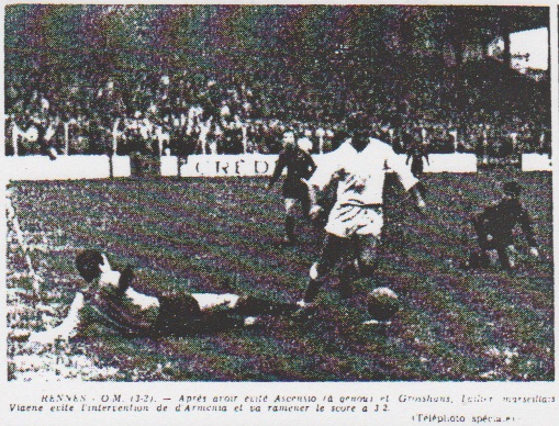 Hélas, le sort est contraire aux maillots blancs qui n'arriveront pas à arracher ce match nul pourtant bien mérité. Mais voyons les faits. De la 45ème à la 90ème minute, nous avons noté : A la 50me minute, Loncle passe à Levaud, qui manque son tir face à Moreira, sorti de ses buts. À la 51me minute, tir timide de Stopyra. En ce début de seconde mi-temps, l'O.M., comme en première mi-temps, fait le jeu. Un but pour Aygoui A la 57me minute, Aygoui, après une tentative de Sansonetti, tente un tir assez lointain (17 mètres environ) et trompe le gardien breton, gêné par ses partenaires. Les efforts marseillais sont ainsi récompensés partiellement. 3 minutes plus tard, Viaene manque de très peu l'égalisation. Son centre shoote passant devant les buts rennais dégarnis. Jubert creuse l'écart A la 5me minute, sur une faute de Bruneton qui, au lieu de dégager, talonne le ballon, Jubert tir sans trop de conviction. Et Moreira dans un mauvais jour, laisse entrer le ballon. Cela fait 3 à 1. Nous voyons ensuite un corner tiré contre Rennes, puis une belle attaque Milazzo - Sansonetti, qui échoue de très peu. Un but de Viaene A la 75me minute, Ascensio laisse partir Viaene, qui se présente seul devant d'Arménia. Celui-ci en voulant intervenir, glisse et Viaene marque sans opposition aucune. Nous voilà à 3 à 2. À la 78e minute, Sansonetti tente sa chance, mais le ballon n'est pas d'accord avec l'avant-centre marseillais. À la 81me minute, le même Sansonetti envoie le ballon sur la barre transversale. Le goal était battu, mais les bois suppléent le goal. L'O.M. attaque à outrance pour enlever le match nul. Une ultime échappée de Viaene et le dernier espoir (déçu) des Marseillais, et la partie se termine sur se 3 à 2. |