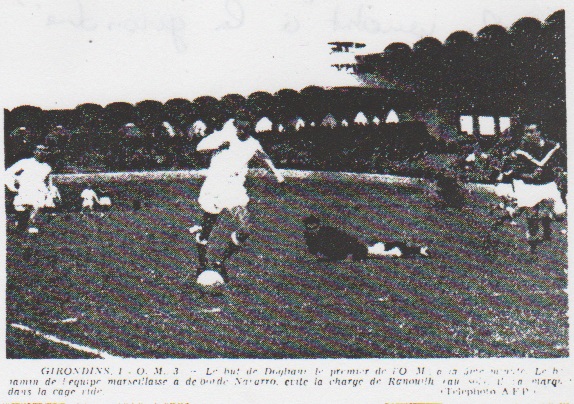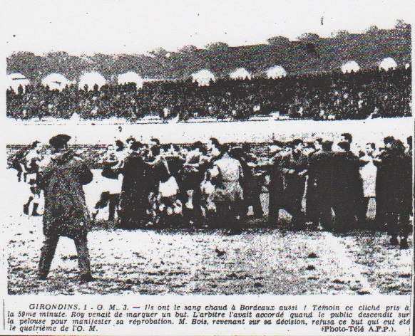 Après la pause, survenue peu après, les Girondins se lancèrent à l'attaque et les incidents se multiplièrent. La peur Ils devaient éclater avec une rare violence à la 59me minute, ou le public bordelais, par son habitude, modifia le score. Expliquons-nous : lancé par Dogliani, Roy se trouva seul à 40 mètres du but adverse. Il partit avec la balle, se crut hors-jeu et se tourna vers le juge de touche, qui lui fit signe de continuer. Roy démarra de plus belle et signa un joli but. Que se passa-t-il ? M. Bois accorda visiblement le but malgré les protestations des joueurs locaux, après avoir consulté son juge de touche, qui revint à sa place, entouré par les joueurs bordelais. M. Bois pendant ce temps, ramenait la balle au centre, ce que voyant, la foule descendit dans l'arène, entourant est frappant le juge de touche, bousculant M. Bois, qui décida tout simplement qu'il n'y avait pas but. Comment appelez-vous cela ? Nous, nous appellerons de la peur, de la sainte frousse. Justice imminente Mais après six minutes d'interruption, la partie reprit, et d'un trait, à la 65me minute donc, Dogliani lança Sansonetti, qui traça un véritable slalom au milieu des Bordelais avant de signer le 3me but marseillais d'un très bon tir croisé. Sur sa lancée, déchaîné, l'O.M. faillit aggraver la marque, à la 68me minute, au Roy, après un dribble énergie énergique, tirait de peu à côté ; à la 70me minute, ou Roy lança Dogliani, qui plaça un bon tir du gauche, arrêté par Ranouil ; à la 73me, ou une passe remarquable de Dogliani permit à Milazzo de tirer mais également à Ranouil d'arrêter encore. Les dernières réactions bordelaises furent d'une extrême violence, et Gori, à deux reprises passa très près de la réussite, à la 81me minute, ou il échoua sur Leonetti et Moreira après un cafouillage invraisemblable ; à la 87me minute, d'un tir terrible, paré remarquablement par Moreira. Mais l'O.M. avait gagné et bien gagné. |
