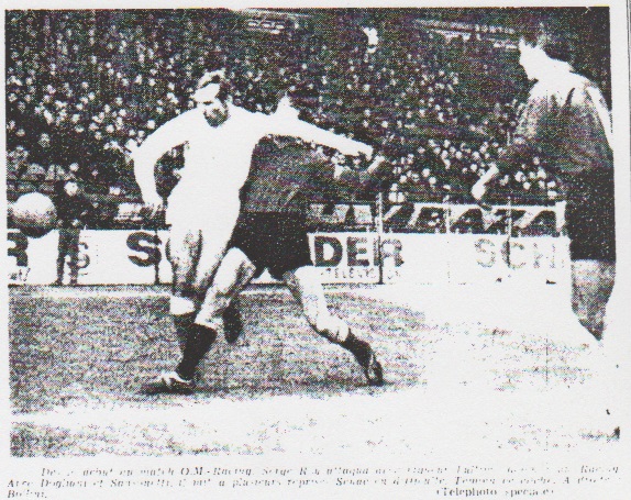 L'après-midi aurait pu être marseillais : un soleil d'azur, les acclamations prolongées pour saluer l'entrée de l'O.M. sur le terrain, un quart d'heure (le premier) tout avantage des Provençaux, trois occasions de buts assez sensationnelles et cela pourrait inciter à croire à la prédominance de Marseille. En fait, la journée fut parisienne : il faisait froid, le Racing marqua trois buts dont deux grâce aux erreurs d'un homme de l'Est. L'affaire avait commencé à toute allure : en quatre minutes de temps nous assistions à une attaque résolue du duo Roy - Dogliani, un tir de Milazzo puis à une percée de Dogliani arrêté par un plongeon risqué de Taillandier et enfin à un tir un peu trop enlevé de Roy. Encore trois offensives Un court entr'acte sous forme de corner obtenu par le Racing et les Marseillais reprenaient leurs offensives incessantes dont voici le détail : 1.) Dogliani à la suite d'un brillant slalom arrive devant le goal parisien qui plonge et s'abîme le poignet en voulant arrêter le dernier possesseur de la balle : Roy ; 2.) Sansonetti, bien accroché au sol, fonce et effectue un centre shoot dont la reprise est manquée d'un cheveu par Roy ; 3.) Rial fort bien placé à moins de 10 mètres des buts parisiens tire bien au-dessus de la barre transversale. L'O.M. fait figure de meneur de jeu, ainsi, à la 16me minute ou, à la suite d'une action très concertée de Sansonetti et de Roy, le demi centre Bollini saute ses buts à la "désespérée". Le but de l'injustice C'est alors que l'avenir du match s'annonçait favorable pour l'O.M. qu'un "coup fourré" se produisait. Nous en étions à la 19e minute sur une balle à suivre propulsée par Senac. Knayer, raide et emprunté, manque un renvoi qui paraissait devoir être facile. Van Sam, bien placé, ne gaspille pas cette aubaine et marque le but devant Moreira qui n'y pouvait rien. Les Marseillais ne se découragent pas pour autant : mais Sansonetti démarqué à environ 15 mètres des buts parisiens, à gauche du terrain, marche sur la balle alors qu'il semblait avoir une occasion valable. |