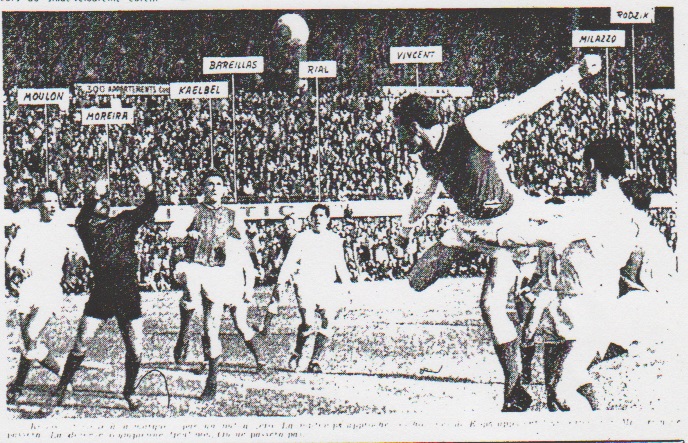 Sauvetage de Milazzo A la 69e minute le camp de Marseille frémit. Sur un coup franc, Kopa botta. Moreira lâcha la balle. Milazzo intervint fort à propos pour éloigner le danger et envoyer la sphère, vers le milieu du terrain. Sauvage entama peu après un sprint fort dangereux (71e) mais Moulon surgit et d'un tacle décidé dégagea. Sur un tir magnifique de Dogliani (75e), Barreau repoussa la balle difficilement. Moreira fit preuve de promptitude en subtilisant la balle destinée à Akesbi et en la mettant en corner (76) Les Champenois semblaient dans cette période avoir retrouvé une grande partie de leurs moyens et de leur facilité. Mais les olympiens réagirent encore avec vigueur. C'est ainsi que Roy, tira dans sa foulée (76e), Sansonetti envoya un bolide au-dessus (81e). Sur un sens de Sansonetti (85e), Barreau exécuta une parade spectaculaire. La dernière chance. A la 87me, Reims faillit obtenir l'égalisation à laquelle il ne pouvait ne croyait plus. Piantoni avait lobé Moreira mais Moulon bondissant comme un diable, renvoya la balle qui allait pénétrer dans la cage du vide. Les hommes de Batteux avaient sans doute laissé échapper leur ultime chance. Et c'est Marseille qui parut capable d'augmenter la marque en sa faveur. Sansonetti à la fin d'une corse rapide, donna un boulet de canon que Barreau qui parvient à le renvoyer d'extrême justesse. Et M. Bois siffla la fin de la partie. L'Olympique avait battu Reims par un but à zéro et, confirma ainsi sa qualification brillante en seizième de finale obtenue 72 heures plus tôt au stade des Hespérides. Des centaines de gosses envahirent le ground pour aller féliciter des olympiens qui avaient mérité d'être entourés ! |